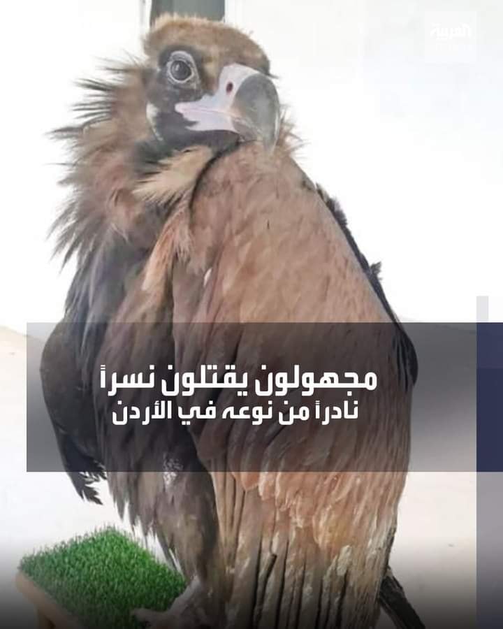 رم - أقدم مجهولون على إطلاق النار على نسر أسود عملاق نادر من نوعه في محمية برقع التابعة للجمعية الملكية لحماية الطبيعية.