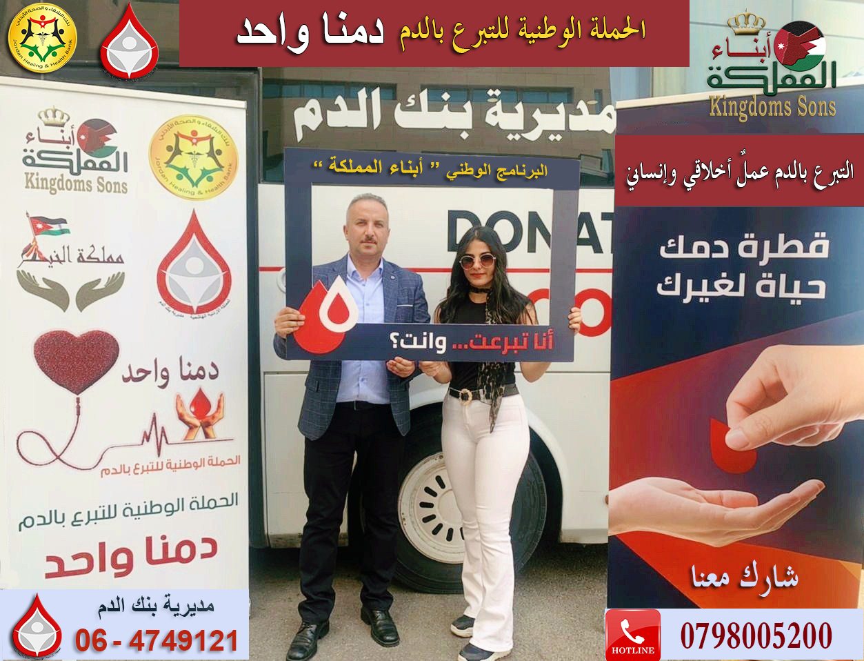 رم - بهدف نشر ثقافة التبرع بالدم بين مختلف شرائح المجتمع وتحديداً بين شريحة الشباب ، أطلق البرنامج الوطني " أبناء المملكة " وبالشراكة مع بنك الشفاء والصحة الأردني ومديرية بنك الدم ، حملة وطنية حملت عنوان " دمنا واحد " .