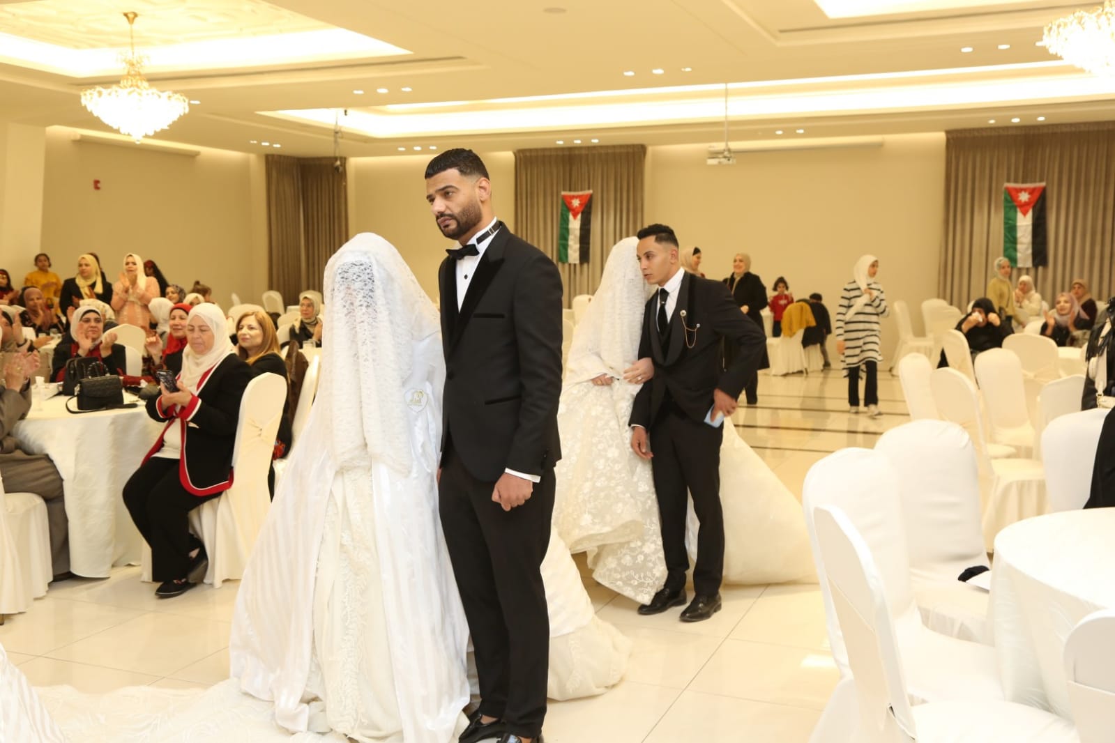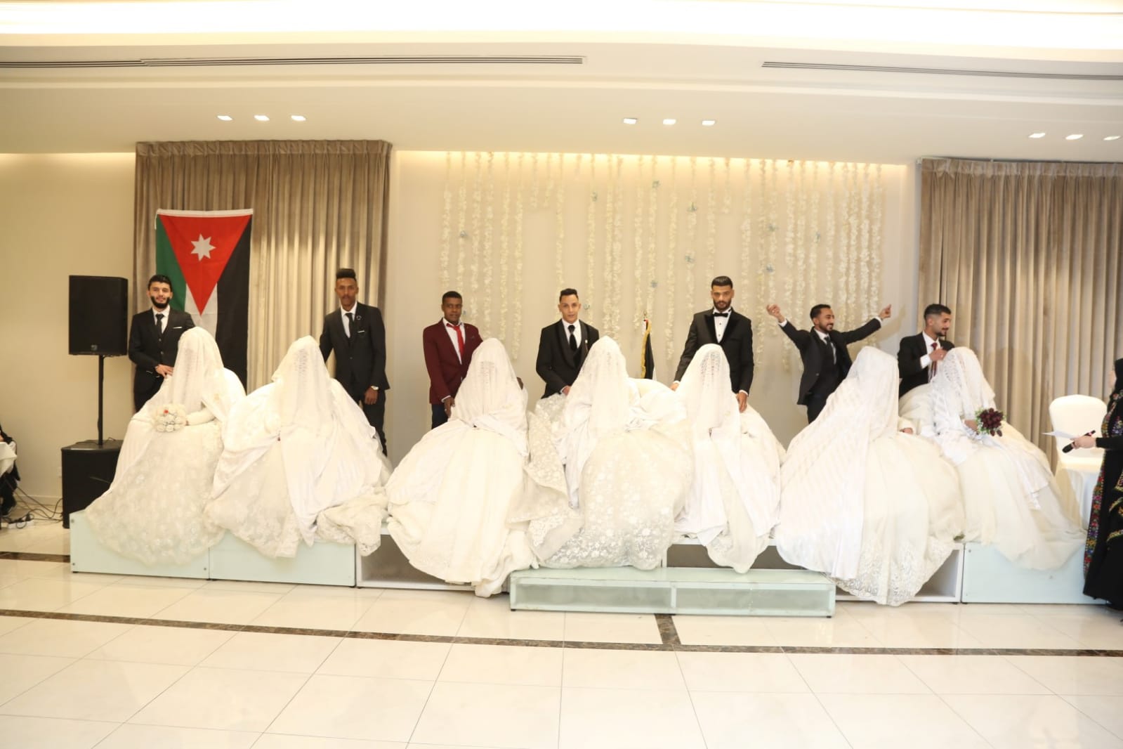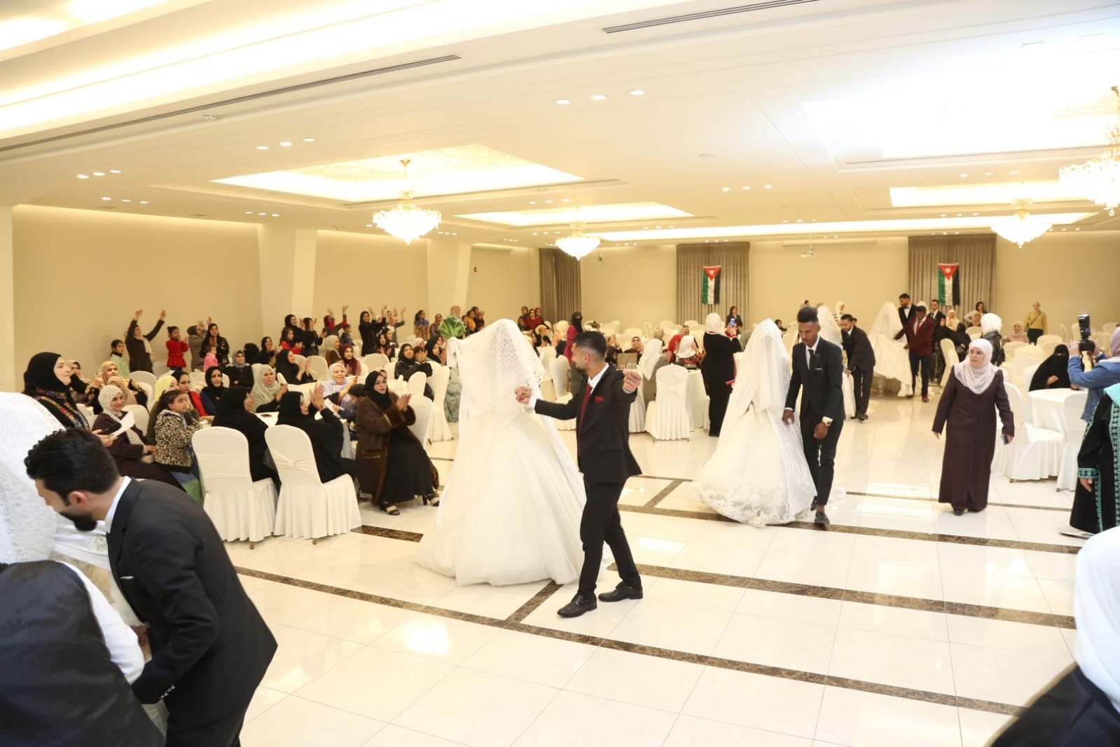 وفي أجواء من الفرحة الغامرة دخل موكب العرسان والعرائس قاعة حفل النساء وسط زغاريد النسوة والأهازيج الشعبية في تظاهرة فرح وطنية بمشاركة ستة عشر عائلة أردنية من مناطق متعددة.