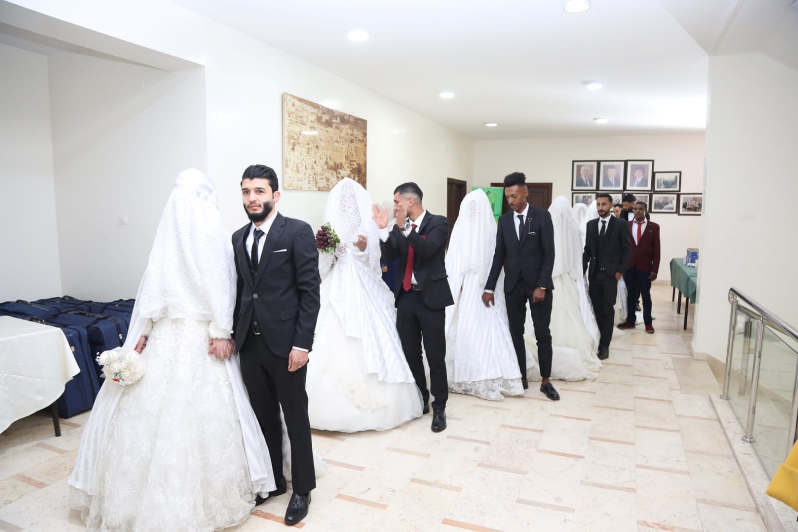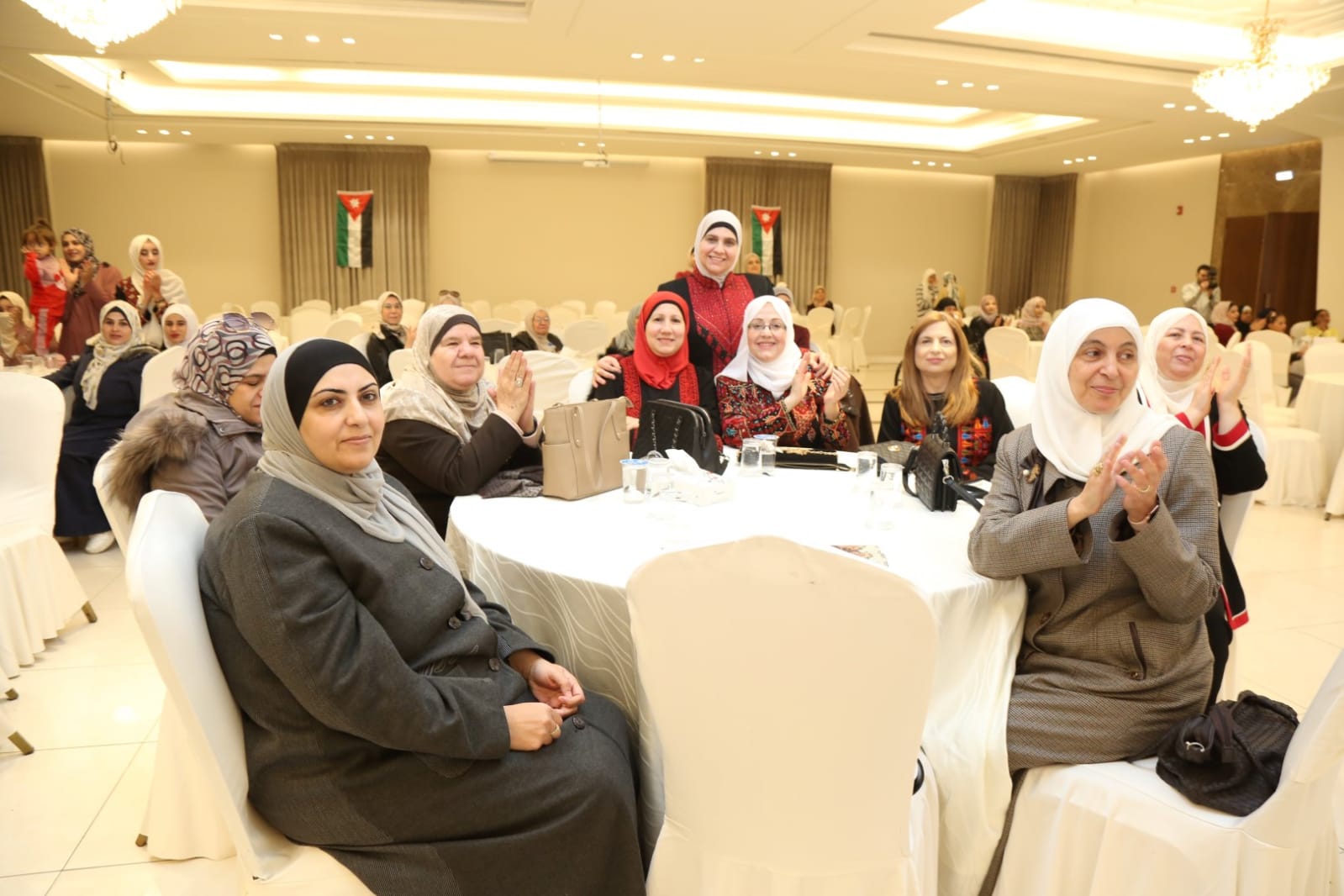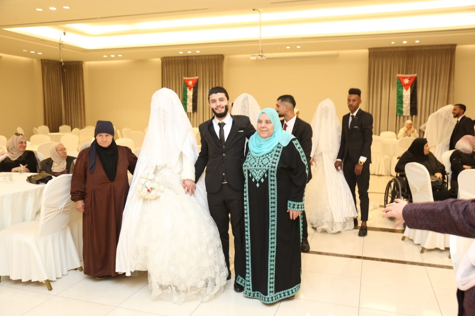 وفي أجواء من الفرحة الغامرة دخل موكب العرسان والعرائس قاعة حفل النساء وسط زغاريد النسوة والأهازيج الشعبية في تظاهرة فرح وطنية بمشاركة ستة عشر عائلة أردنية من مناطق متعددة.