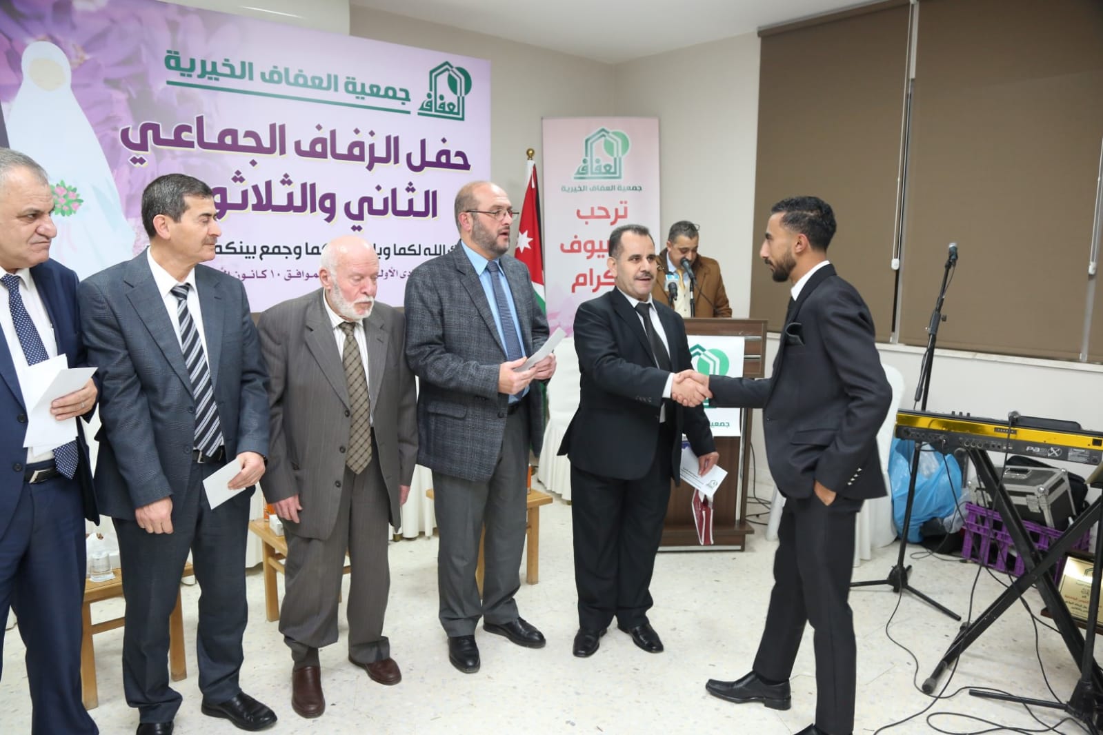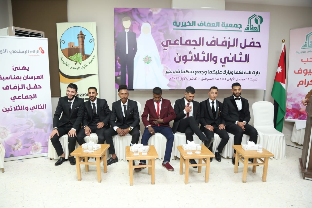 رم - نظمت جمعية العفاف الخيرية مساء أمس السبت حفل الزفاف الجماعي الثاني والثلاثين بمشاركة ستة عشر عريساً وعروساً ضمن برنامجها الهادف إلى تيسير سبل الزواج.