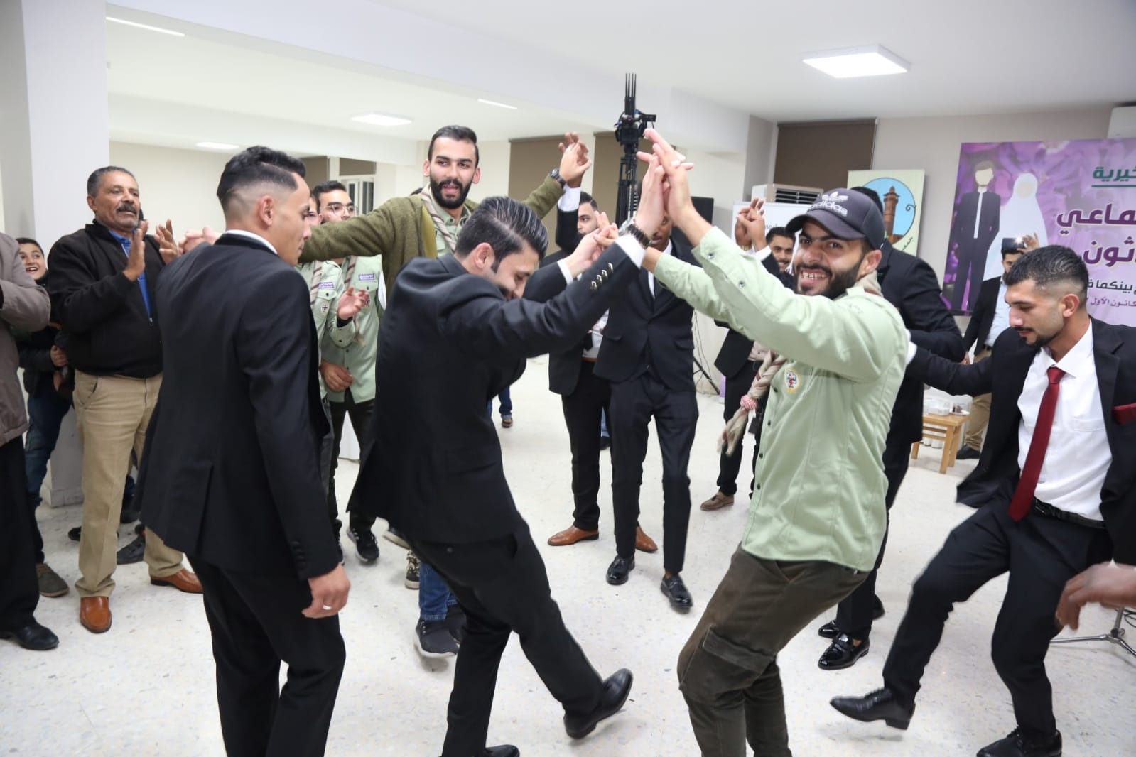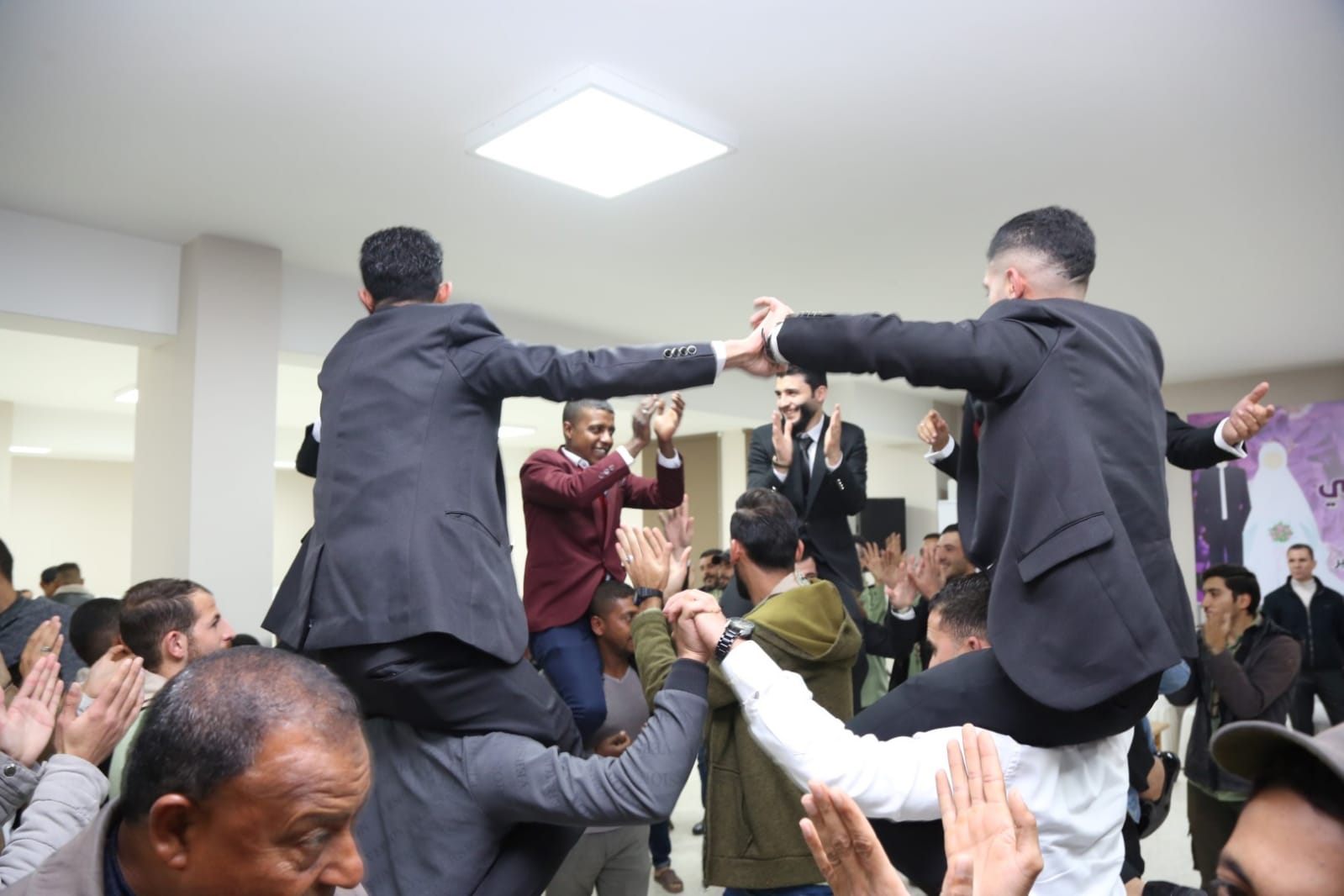 ولدا وصول العرسان إلى قاعة حفل الرجال بمصاحبة الفرقة الفنية اقيمت حلقات الدبكة المرحبة بالعرسان شارك فيها العرسان وذويهم والمدعوين.