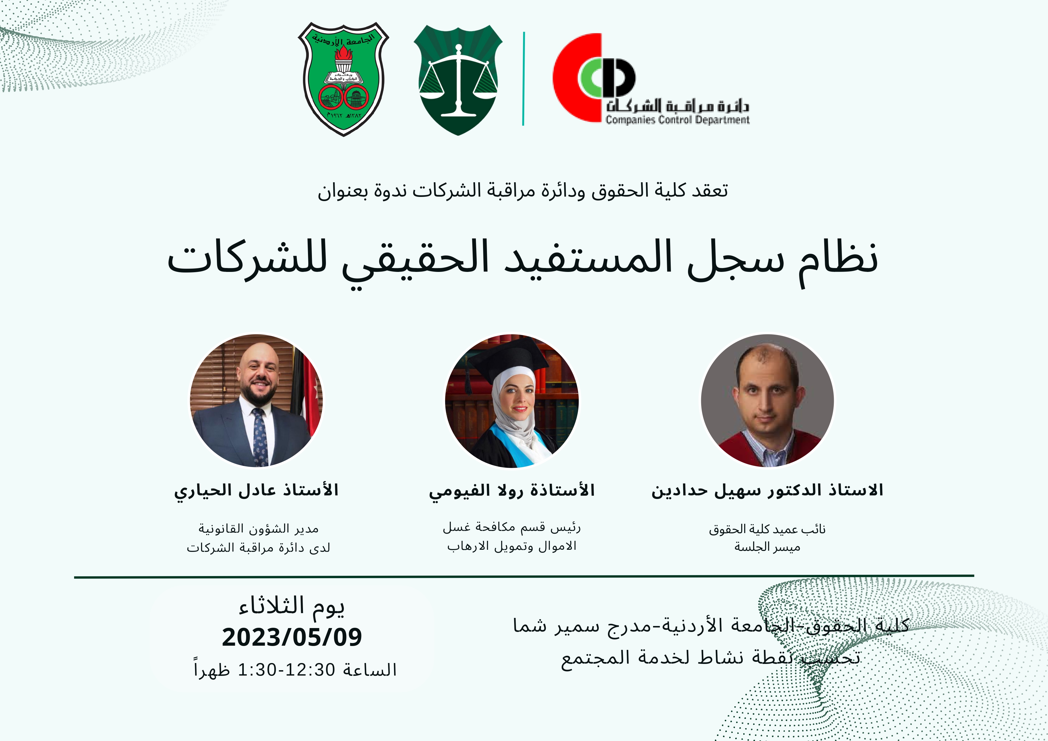 رم - نظمت كلية الحقوق في الجامعة الأردنية، اليوم الثلاثاء، بالتعاون مع دائرة مراقبة الشركات في وزارة الصناعة والتجارة، ندوة تثقيفية حول نظام سجل المستفيد الحقيقي للشركات.