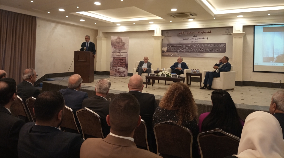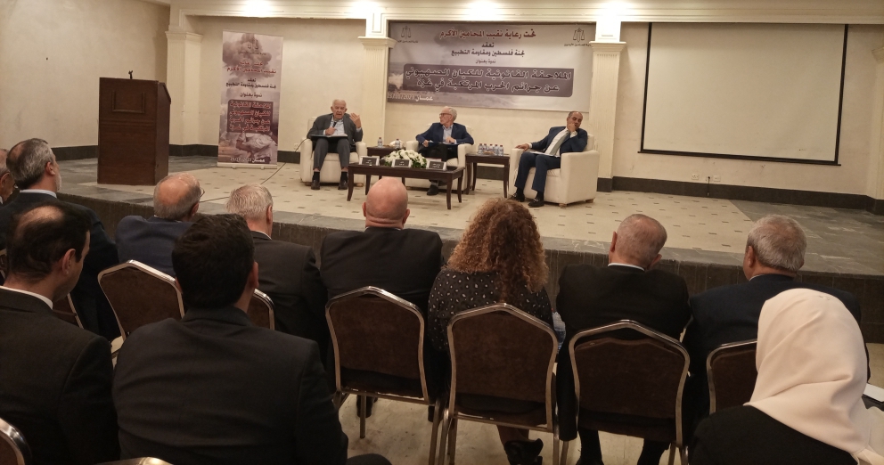 جاء ذلك خلال ندوة عقدتها لجنة فلسطين ومقاومة التطبيع في نقابة المحامين تحت رعاية نقيب المحامين يحيى ابوعبود بعنوان "الملاحقة القانونية للكيان الصهيوني عن جرائم الحرب المرتكبة في قطاع غزة".