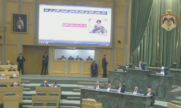 عرض مجلس النواب عبر شاشاته تحت قبة البرلمان، الاتصال الذي أجراه جلالة الملك عبدالله الثاني مع قائد قوة المستشفى الميداني الأردني في قطاع غزة العقيد ثائر الخطيب.
