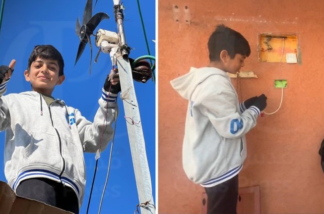 ما شاء الله ولا قوة الا بالله هذا الطفل حسام العطار عمره ٩ سنوات عبقري ويسمى نيوتن غزة استخدم طاقة الرياح ليولد كهرباء لخيمة اهله غزة باذن الله لن تقهر pic.twitter.com/EKpRaWRw3G