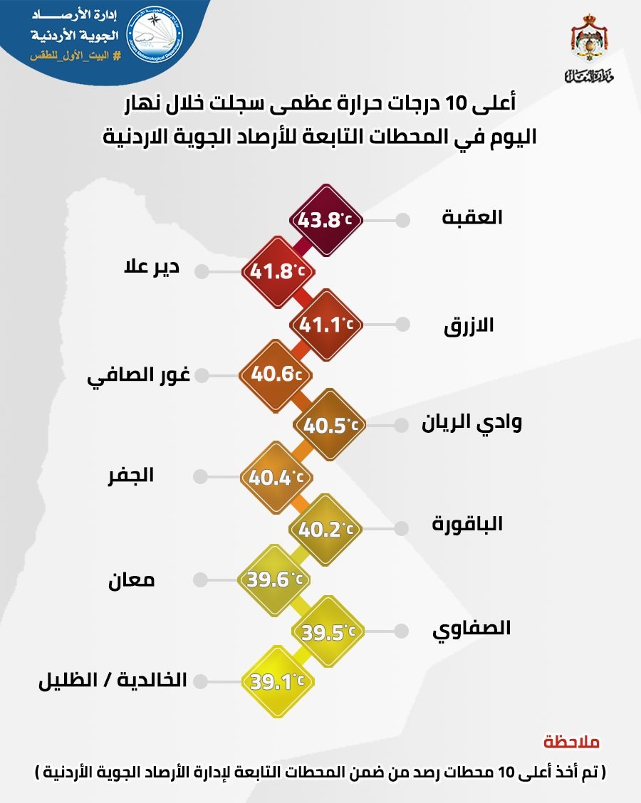 وبينت ان اعلى درجة حرارة سجلت اليوم في العقبة وبلغت 43.8°C، ثم دير علا 41.8 c، الازرق 41.1c، غور الصافي 40.6c، وادي الريان 40.5 c، الجفر 40.4 c، الباقورة 40.2 c، معان 39.6°C، الصفاوي 39.5، الخالدية / الظليل 39,1