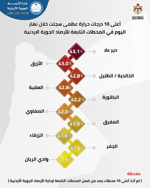 وبحسب الأرصاد فقد سجلت محطة ديرعلا أعلى درجة حرارة حيث وصلت لنحو 43.1 درجة مئوية ،تلتها محطة الأزرق بنحو 43 درجة مئوية .