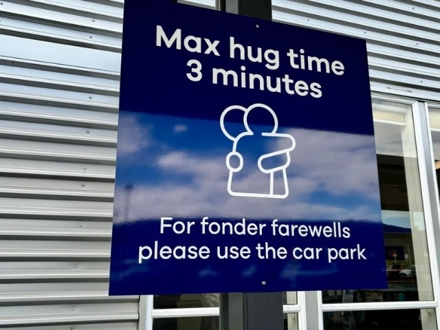 وعلقت سلطات المطار لافتة في منطقة إنزال المسافرين، وعليها التعليمات الجديدة للأحضان، وطلبت ممن يريد وقتا أطول للوداع التوجه إلى موقف السيارات القريب.