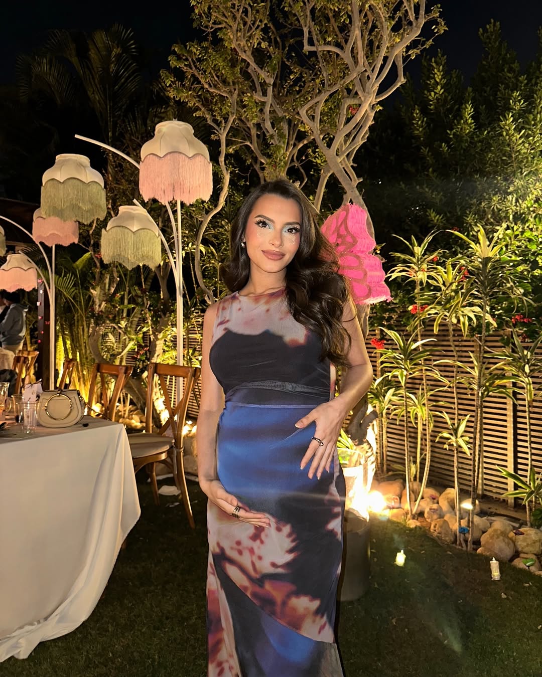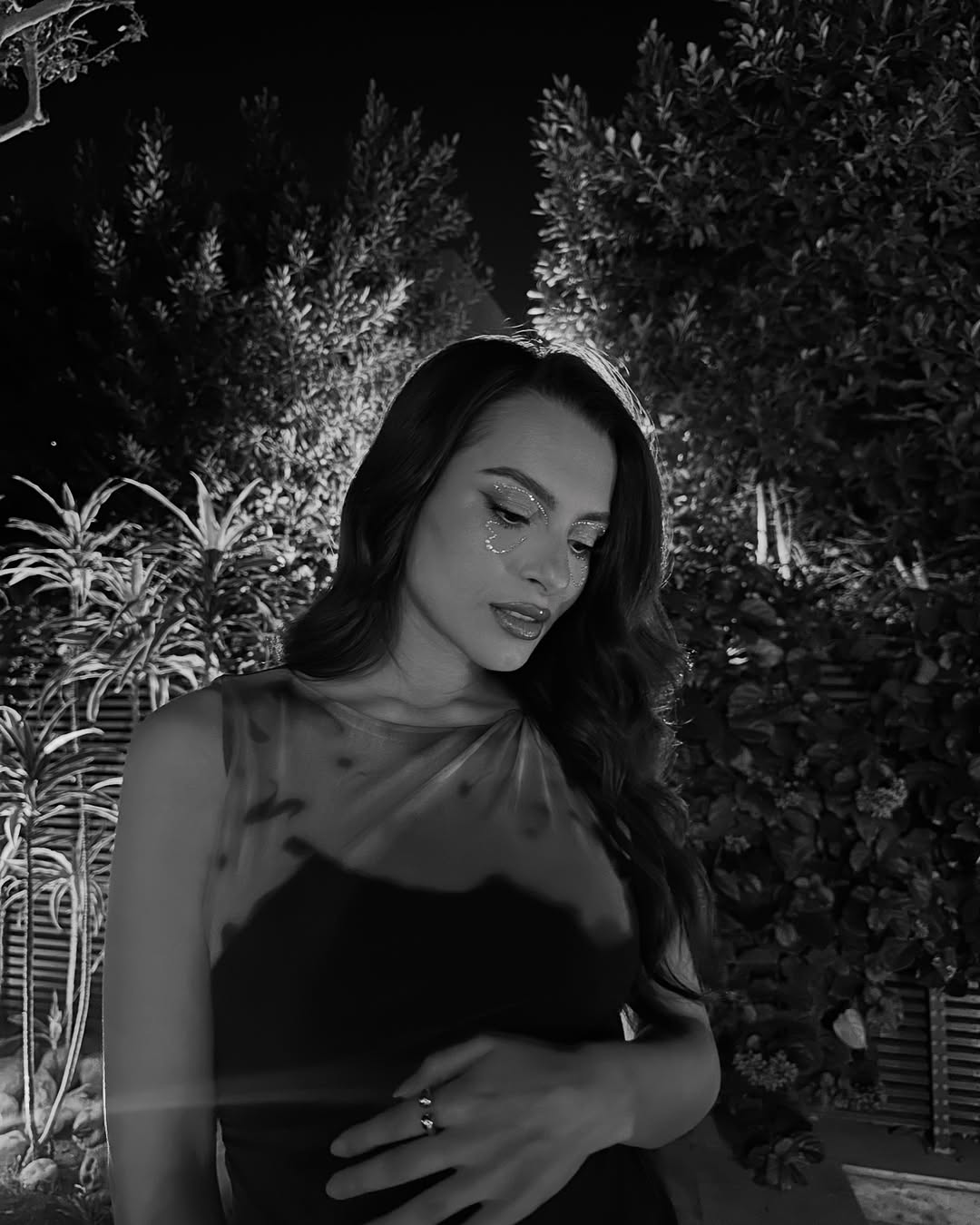 رم - بعد إعلانها مؤخرا عن حملها بطفلها الثاني، شاركت النجمة المصرية #كارمن_سليمان صورا عبر حسابها في إنستغرام، لها من تواجدها في حفل توديع عزوبية إحدى صديقاتها، إذ ظهرت بإطلالة مميزة تبرز حملها بفستان يجمع اللون الأزرق والأسود والبيج، واعتمدت مكياجا لامعا يتماشى مع ألوان الفستان، واعتمدت رسم أجنحة الفراشة باللون الفضي.