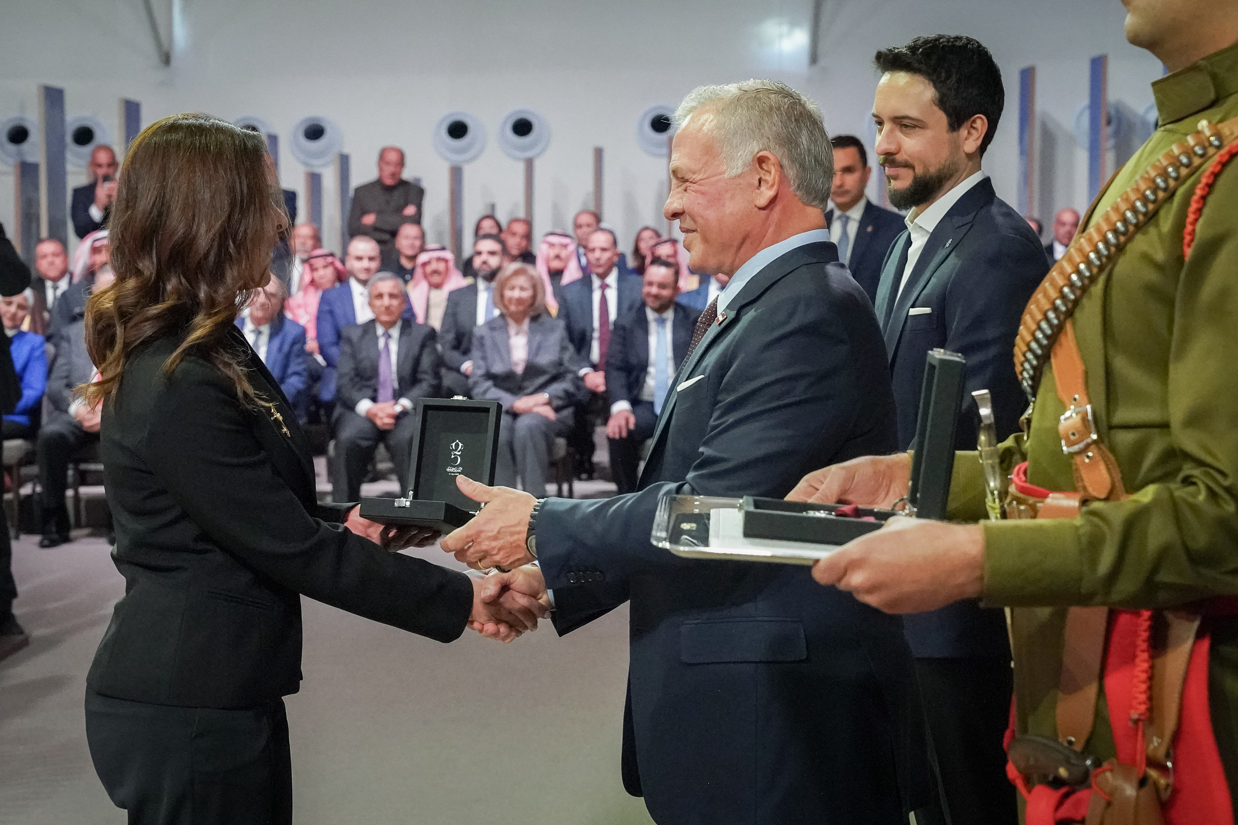 5. المرحوم الدكتور نزال فياض عبدالقادر السكر العدوان لإسهاماته في تقديم خدمات علاجية بالمجان للمحتاجين على مدى 60 عاما من الخدمة، تتسلم الميدالية ابنته الدكتورة ريما نزال السكر العدوان