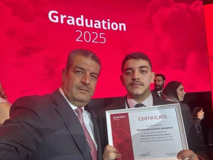 رم - "مبارك لابن الصديق مؤيد القريوتي الكابتن الطيار عبدالله مؤيد القريوتي على تخرجه من كلية الطيران في دولة الإمارات العربية هذه لحظة فخر واعتزاز وتميز في حياتك، يا عبدالله . لقد عملت بجد وثبات لتحقيق هذا الحلم، والآن أنت جاهز لتحقيق أهدافك في سماء الطيران.