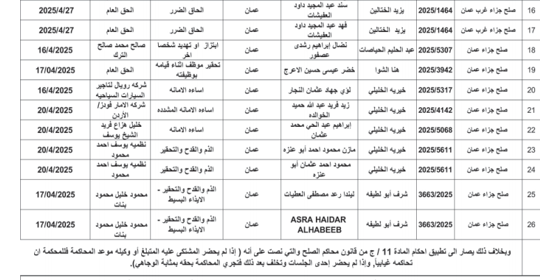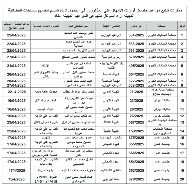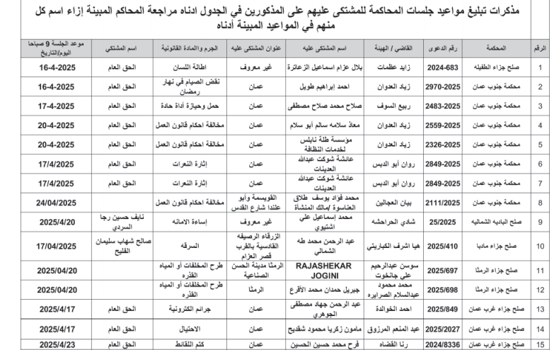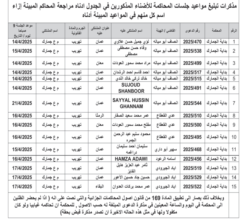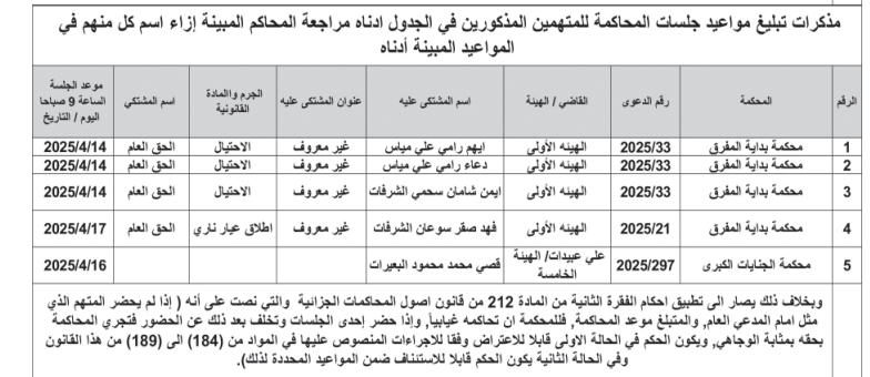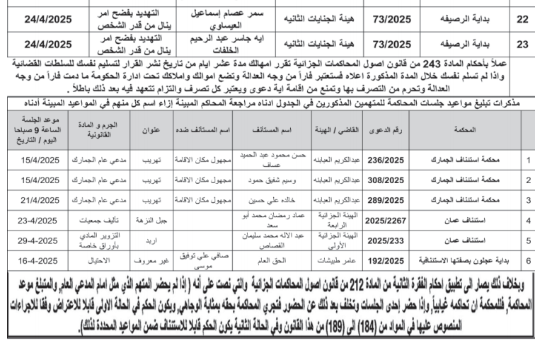 صدرت اليوم الاثنين، مذكرات تبليغ مواعيد جلسات محاكمات لمشتكى عليهم بتهم مختلفة وقرارات إمهال لحضور جلسات محاكمة.