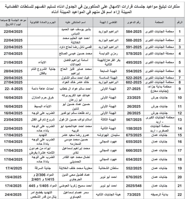 وطلبت المذكرات من المذكورين في الجداول أدناه مراجعة المحاكم المبينة ازاء اسم كل منهم في المواعيد المبينة أدناه.