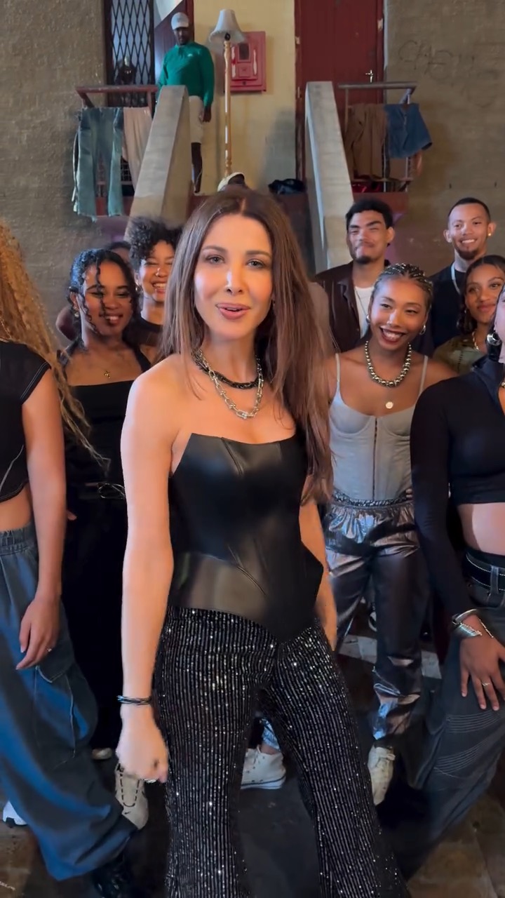 أما الإطلالة الثانية فكانت باللون الأسود، حيث اختارت توبًا من الجلد ونسقته مع سروال لامع فضفاض، وتنوّعت مجوهراتها بين اللونين الأسود والذهبي.