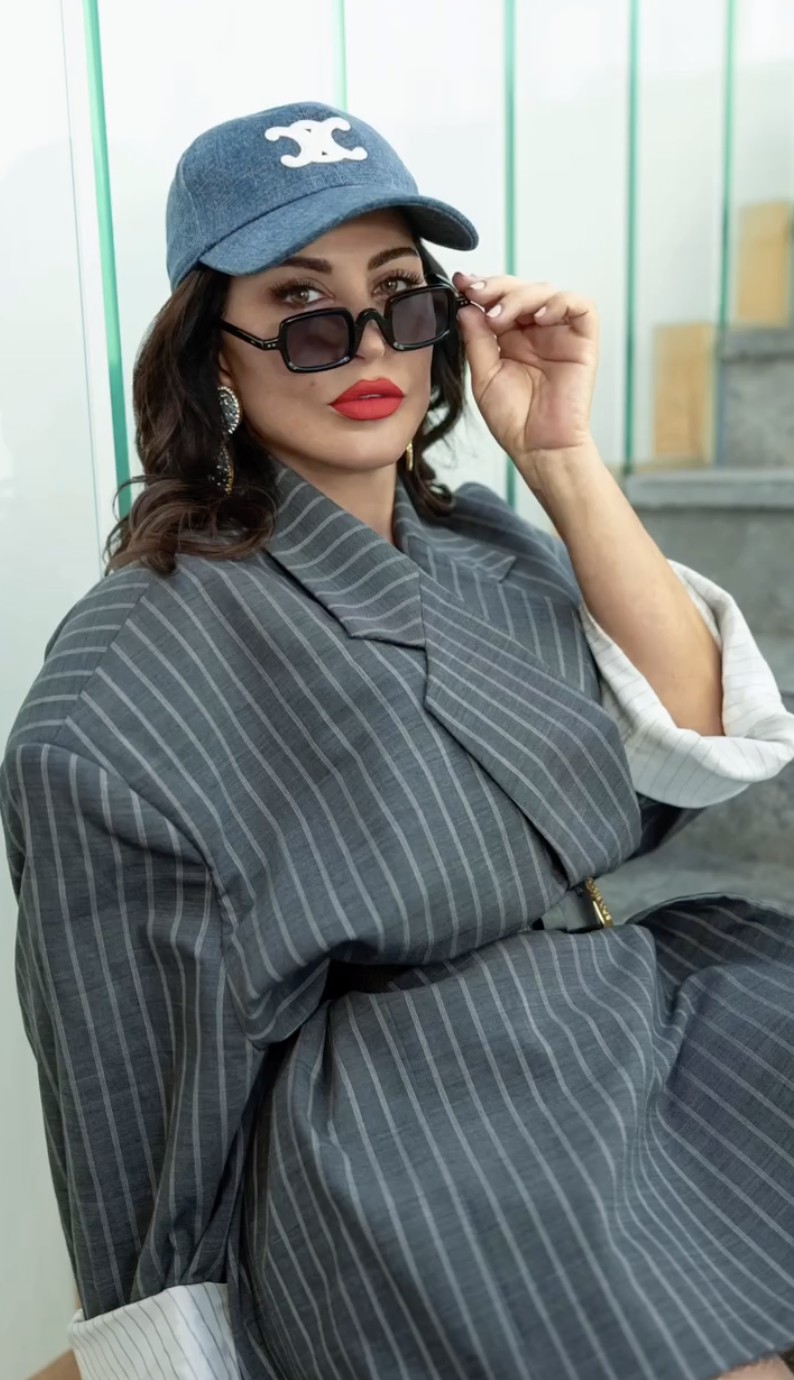 رم - شاركت النجمة #جومانة_مراد صورًا بإطلالة مميزة ببليزر رمادي مخطط باللون الأبيض نسقته مع حزام وحذاء كعب عالٍ باللون الأسود.