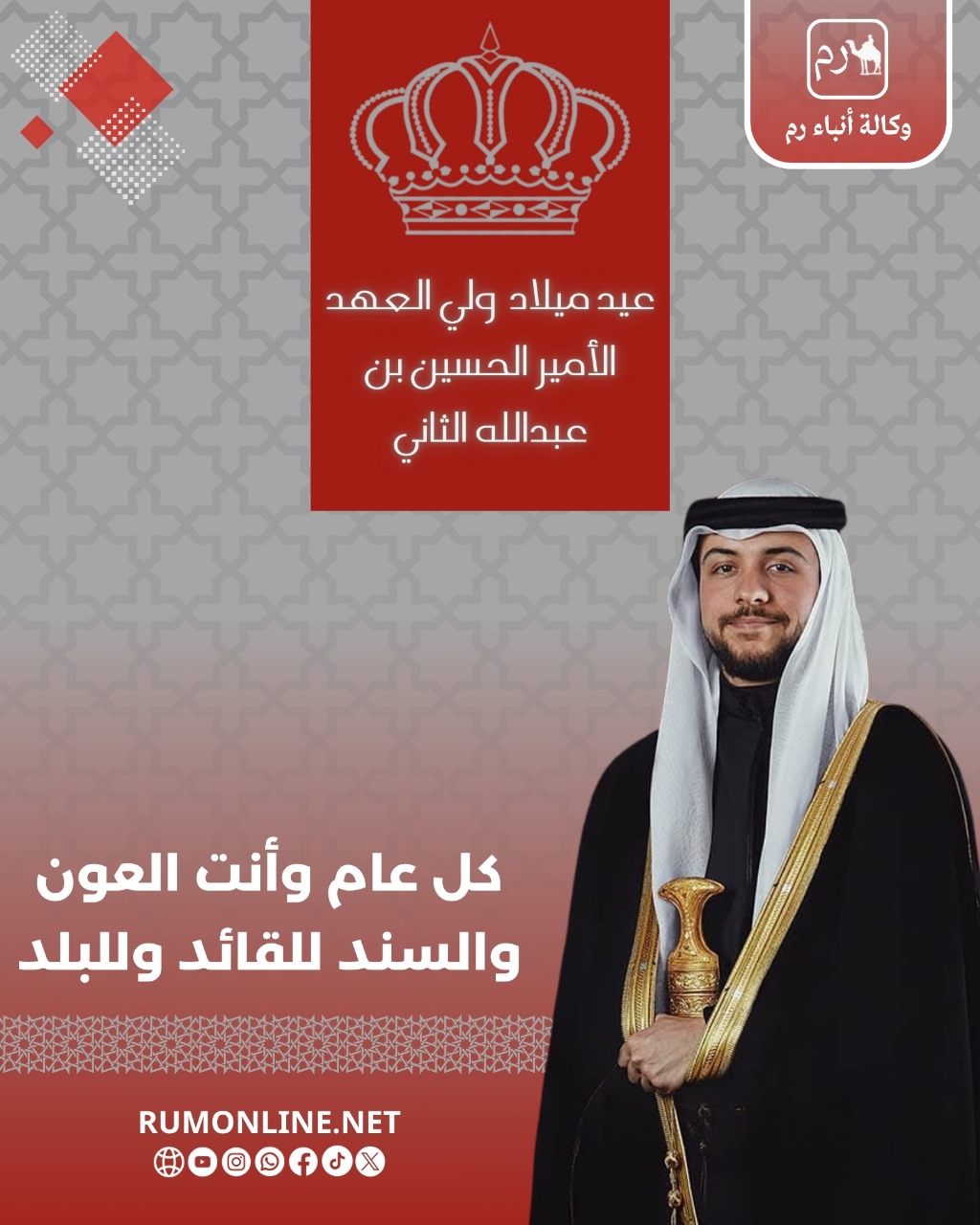رم - تتقدم أسرة #وكالة أنباء_رم من مقام حضرة صاحب السمو الملكي الأمير الحسين بن عبدالله الثاني، ولي العهد المعظم، بأصدق مشاعر التهنئة وأطيب التبريكات بمناسبة عيد ميلاده السعيد. داعين الله أن يديم عليه الصحة والعافية، ويحفظه ذخراً وسنداً لقائد الوطن، جلالة الملك عبدالله الثاني ابن الحسين المعظم، حفظه الله ورعاه.