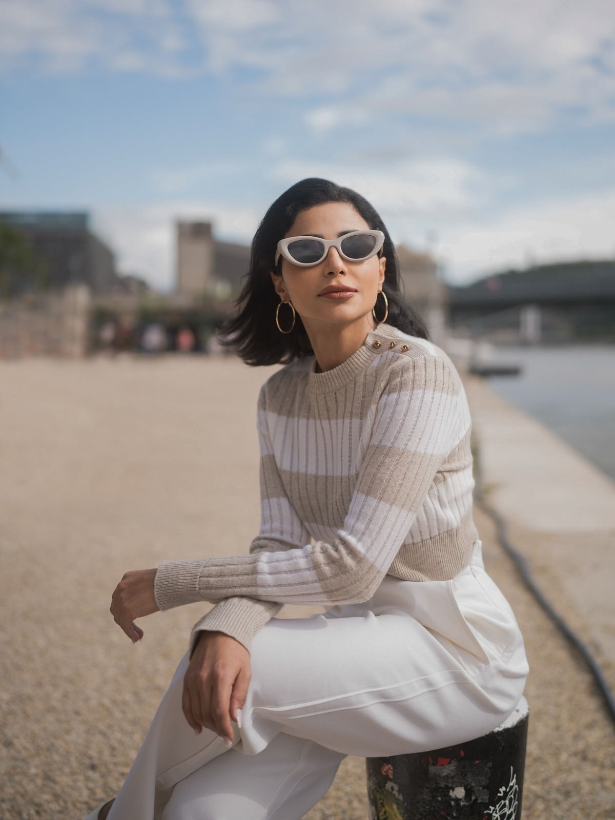رم - تألقت #مهيرة_عبد_العزيز بإطلالة خريفية مميزة، حيث ارتدت بلوزة صوفية قصيرة بخطوط أفقية بلون البيج الفاتح والكريمي، نسّقتها مع بنطال أبيض واسع عالي الخصر مزوّد بأزرار ذهبية، وأكملت اللوك بمعطف طويل واسع بلون حيادي ونظارات شمسية عصرية، وقد نشرت الصور عبر حسابها الرسمي على إنستغرام من أحدث جلسة تصوير قامت بها .