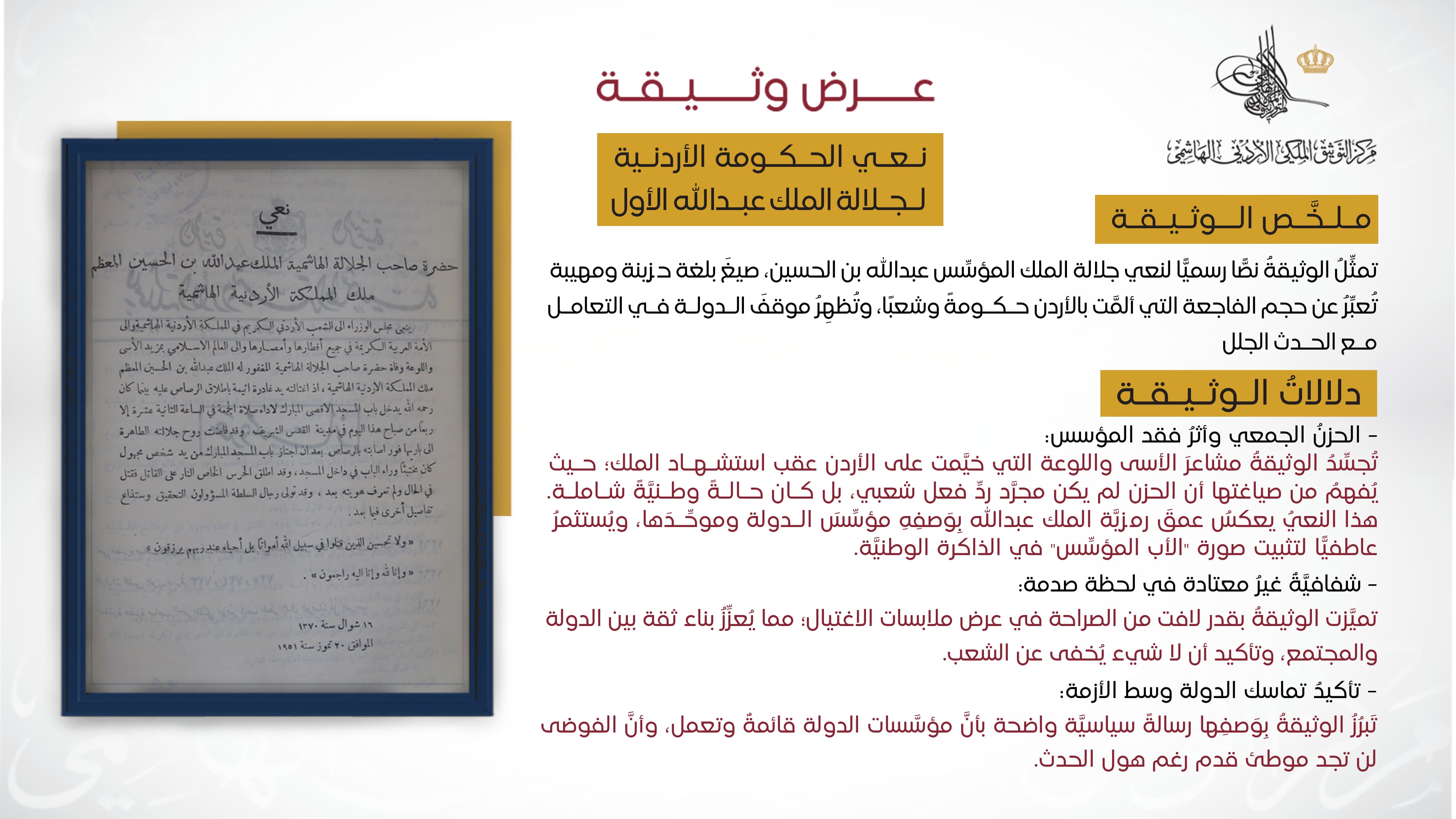 عرض مركز التوثيق الملكي الأردني الهاشمي، في ذكرى استشهاد الملك المؤسس عبدالله بن الحسين، وثيقة نعي رسمية مؤرخة في 20 تموز 1950 صادرة عن مجلس وزراء المملكة الأردنية الهاشمية وموجهة إلى الشعب الأردني.