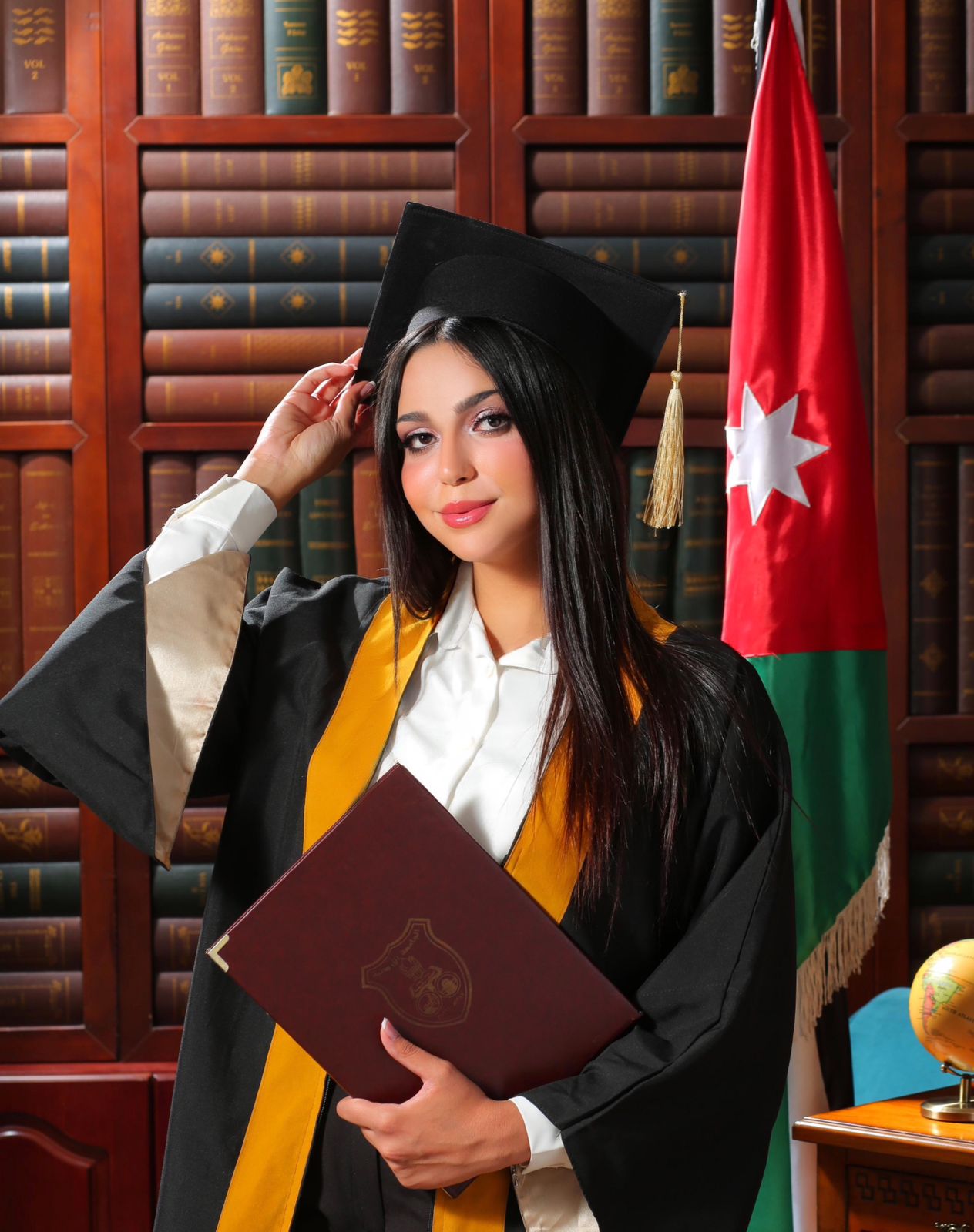 الجامعة الاردنية وحصولها على درجة البكالوريس في الحقوق تخصص قانون بتقدير جيد جدا .