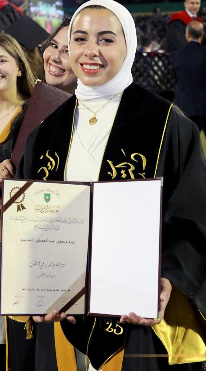إِنَّ تَخَرُّجَ الدِّكْتُورَةِ زِينَةِ مِنْ كُلِّيَّةِ الطِّبِّ الْبَشَرِيِّ يُعَدُّ إِنْجَازًا كَبِيرًا لَهَا وَلِمِشْوَارِهَا الدِّرَاسِيِّ، وَنَتَوَقَّعُ لَهَا مُسْتَقْبَلًا مُشْرِقًا فِي مَجَالِ الطِّبِّ. نَتَمَنَّى لَهَا دَوَامَ النَّجَاحِ وَالتَّفَوُّقِ فِي مَسِيرَتِهَا الْمِهْنِيَّةِ.