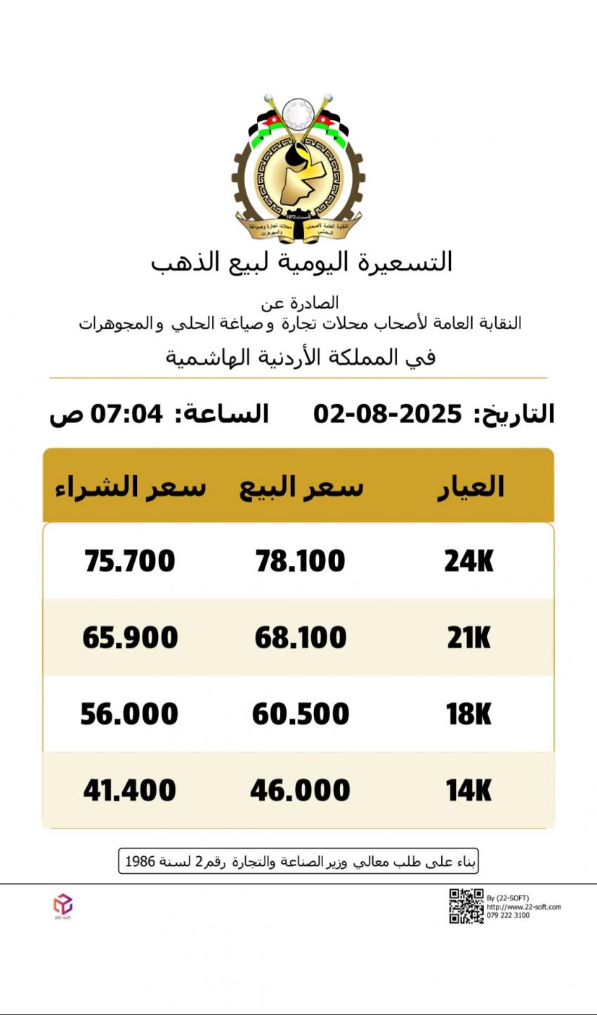 فيما بلغ سعر الغرام الواحد من الذهب عيارات 24 و18 و14 لغايات البيع من محلات الصاغة عند 78.1 و60.5 و46 دينارا على التوالي.