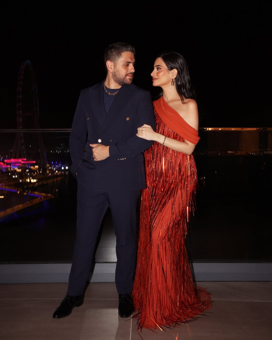 بينما اختار زوجها ميلاد بدلة سوداء من براند MAIZON وأضاف تحتها قميصا باللون الآبيض.. ما رأيك بتنسيقاتهما؟