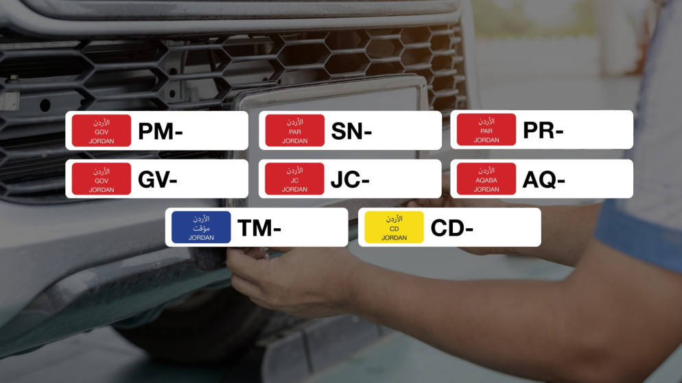 وبموجب التَّعديل، ستحمل لوحات المركبات الحكومية والإدخال المؤقت والدبلوماسية حروفا واضحة تدل على الجهة التي تتبع لها المركبة وعلى النحو الآتي: رئيس الوزراء والوزراء الرمز PM، مجلس الأعيان SN، ومجلس النواب PR، والمجلس القضائي JC، والجهات الحكومية GV، وسلطة منطقة العقبة الاقتصادية AQ، والهيئات الدبلوماسية CD، والإدخال المؤقت TM.