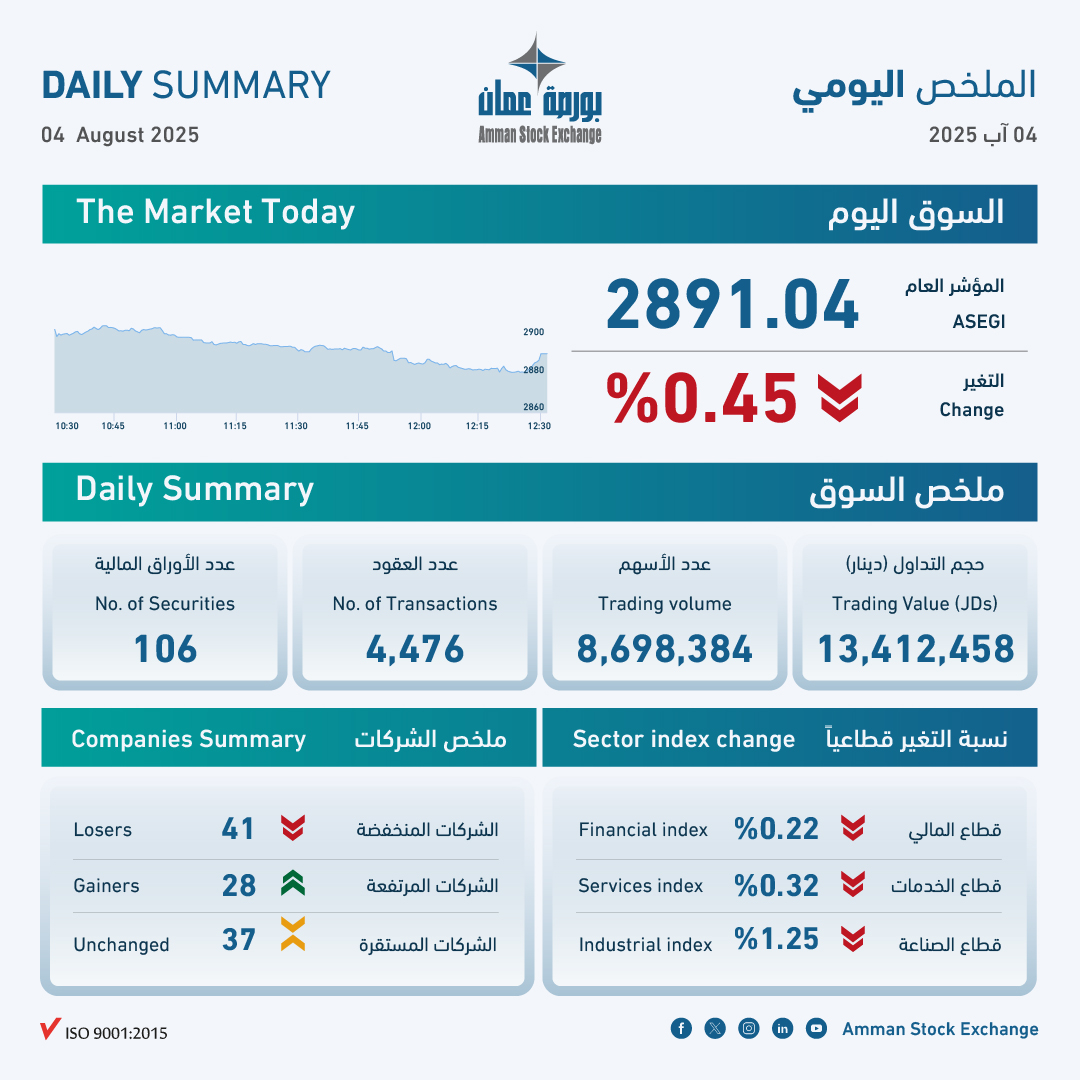 وعن مستويات الأسعار، انخفض الرقم القياسي العام لأسعار الأسهم لإغلاق هذا اليوم إلى 2891 نقطة، بانخفاض نسبته 0.45 بالمئة.