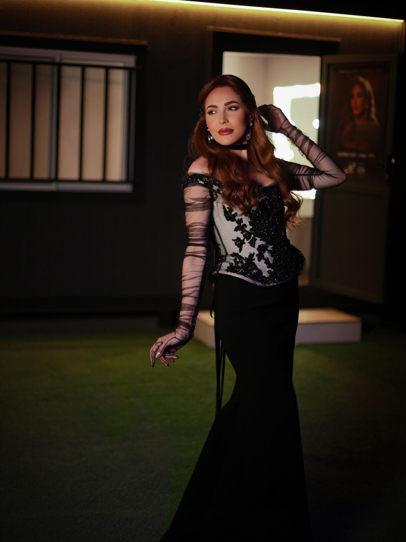 إذ اختارت توب كورسيه مطرّزًا بالأسود على قاعدة فضية، نسّقته مع قطعة سفلية سوداء أنيقة، فيما أضفت القفازات الشفافة لمسة درامية راقية.