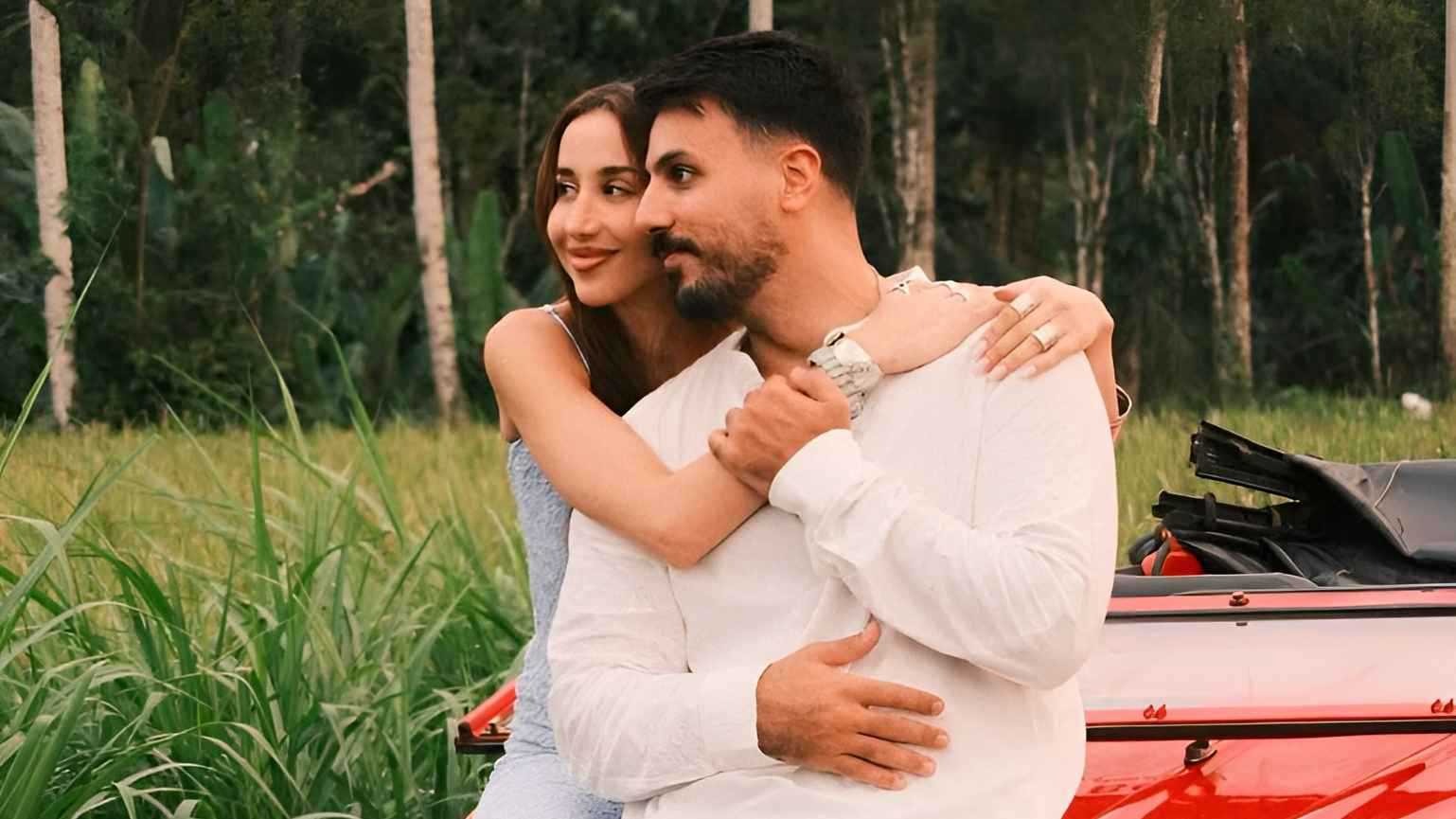 وظهر الثنائي في الصور وهما يقضيان وقتاً ممتعاً في أجواء رومانسية، متكئان على سيارة حمراء، وسط الطبيعة.
