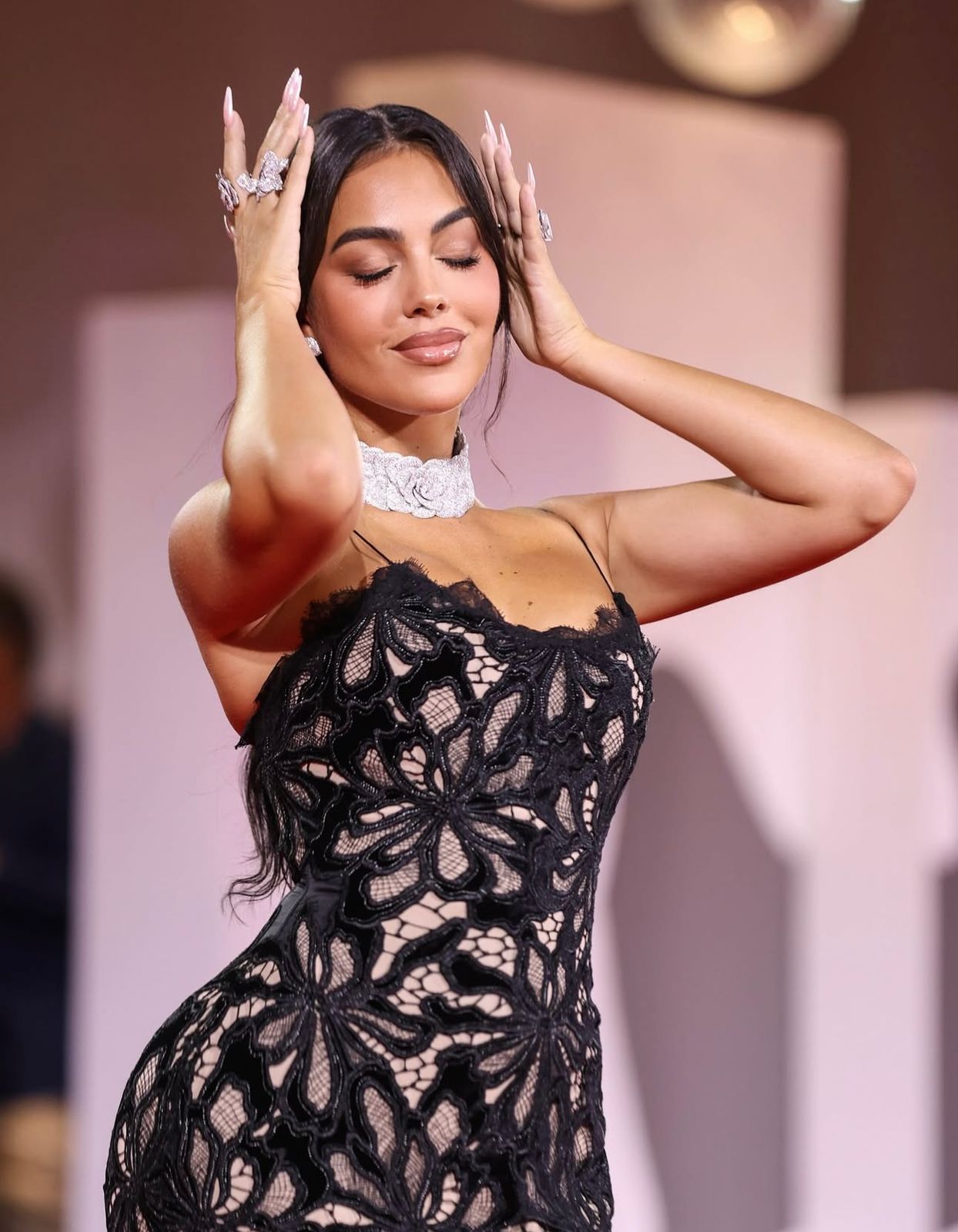 رم - على السجادة الحمراء لمهرجان البندقية السينمائي، اختارت جورجينا رودريغيز فستانًا أسود من توقيع Roberto Cavalli، جاء بتصميم من الدانتيل البارز فوق قاعدة نيود شفافة، مع قصة ضيقة وذيل طويل أضفى لمسة درامية أنيقة على الإطلالة.