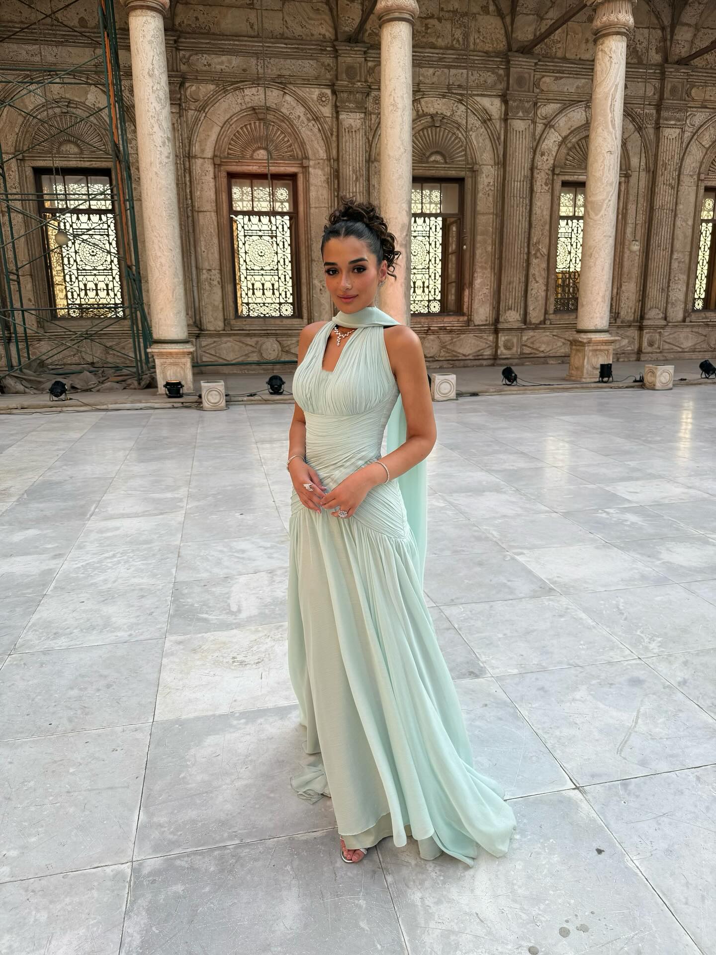 رم - اختارت ملك زاهر فستانًا أنيقًا من تصميم شيري مصطفى، تميّز بياقة ملتفة حول الرقبة مع فتحة أمامية ناعمة، إضافة إلى قماش منسدل من الخلف يعكس طابعًا أنثويًا راقيًا.