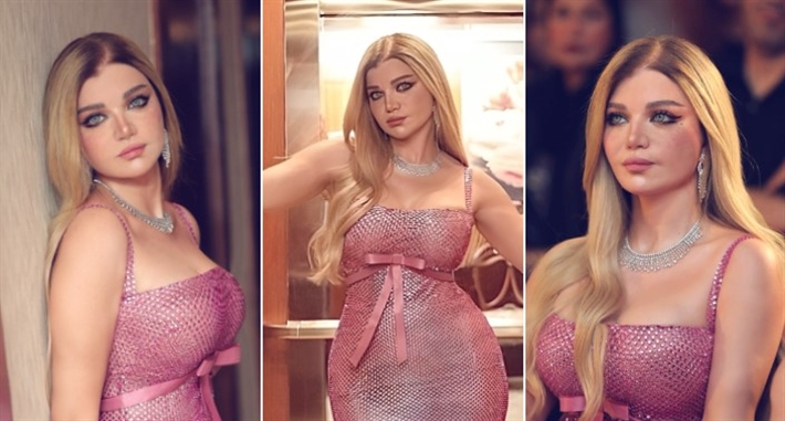 وأطلت ياسمين الخطيب بفستان وردي ضيق لامع يظهر رشاقتها مع حزام أسفل الصدر مزين بفيونكة، من تصميم أحمد عبد الله.