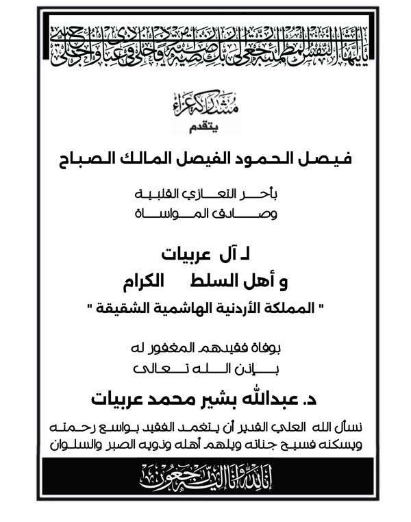 الفيصل المالك الصباح وبأحر مشاعر العزاء والمواساة عشيرة العربيات خاصة وأهل السلط عامة بوفاة فقيدهم