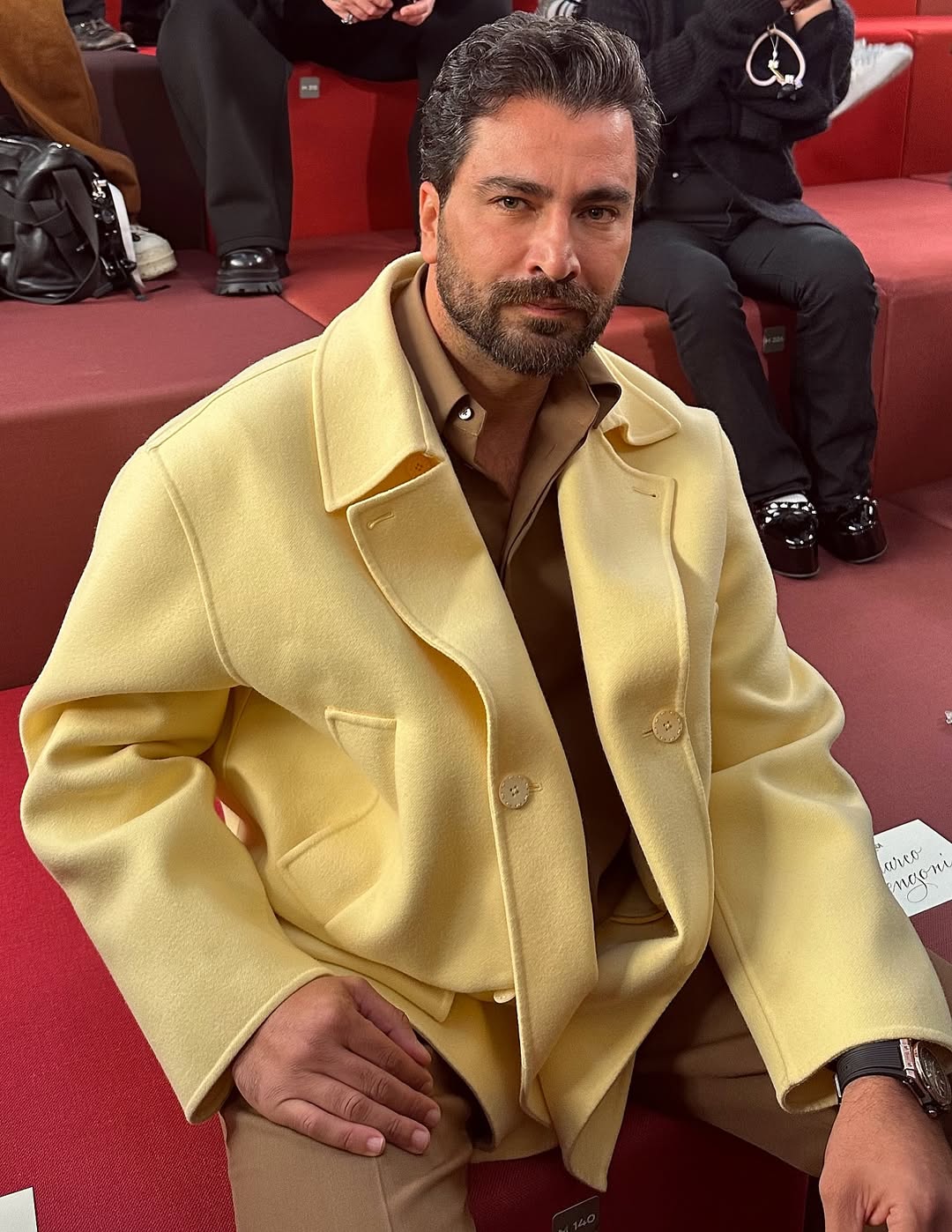وشارك النجم صورًا عبر حسابه على "إنستغرام"، من تواجده في الصف الأول للعرض، متألقًا بطقم مكوّن من قميص وبنطال باللون البني، مع معطف خريفي باللون الأصفر.