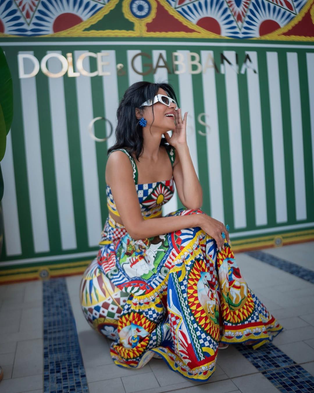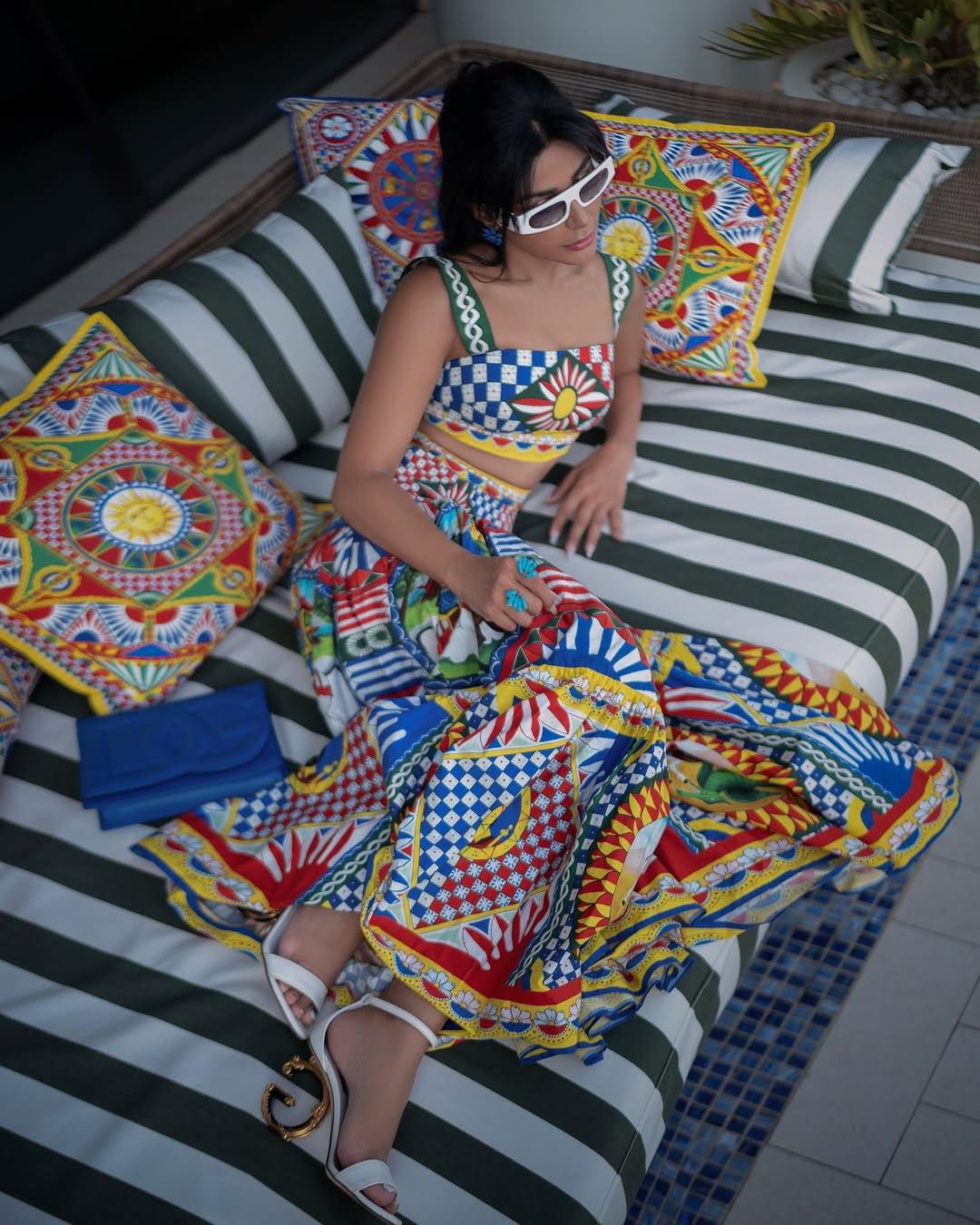 رم - لفتت #مهيرة_عبد_العزيز الأنظار بإطلالة مفعمة بالحيوية خلال ظهورها الأخير، حيث اختارت تنورة مع كروب توب بطابع إيطالي مزدان بالنقوش والألوان الزاهية من توقيع Dolce & Gabbana، وأكملت إطلالتها بنظارات شمسية وحقيبة زرقاء أنيقة، ونشرت الصور عبر حسابها على "إنستغرام".. ما رأيكم بالإطلالة؟