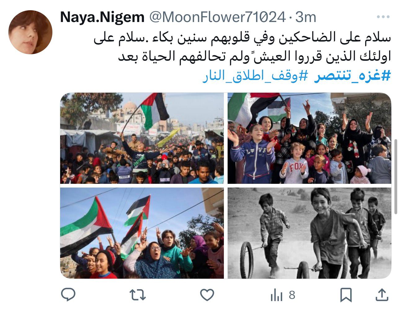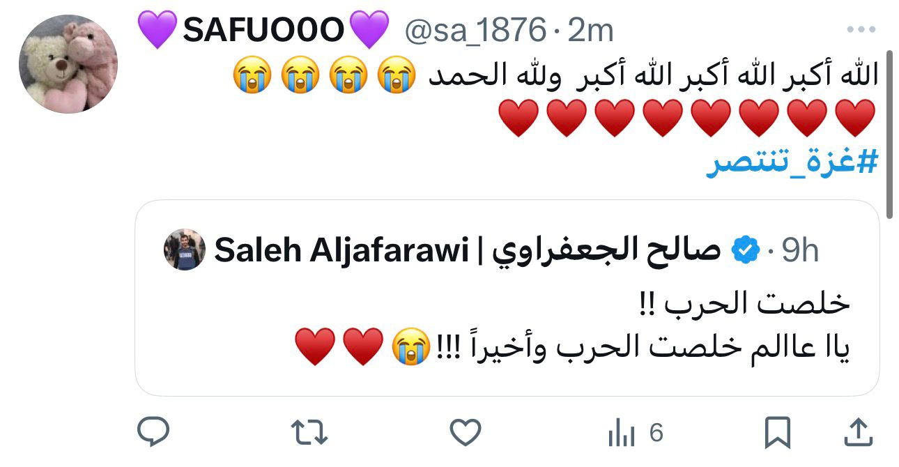 وتصدر وسم #غزة_تنتصر و#وقف_الحرب قائمة الأكثر تداولًا على “إكس”، حيث أعرب المغردني عن تضمامنهم وآمالهم بأن يكون هذا الإتفاق نهاية فعلية للحرب، ومؤكدين فرحتهم بالنصر.