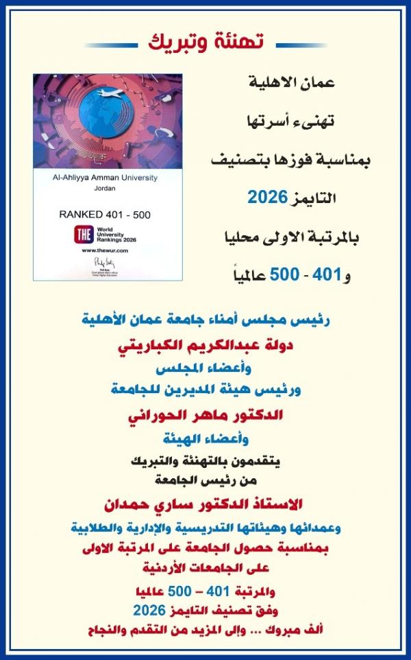 يتقدمون بالتهنئة والتبريك من رئيس الجامعة الاستاذ الدكتور ساري حمدان وعمدائها وهيئاتها التدريسية والإدارية والطلابية بمناسبة حصول الجامعة على المرتبة الاولى على الجامعات الأردنية والمرتبة 401 – 500 عالميا وفق تصنيف التايمز 2026.