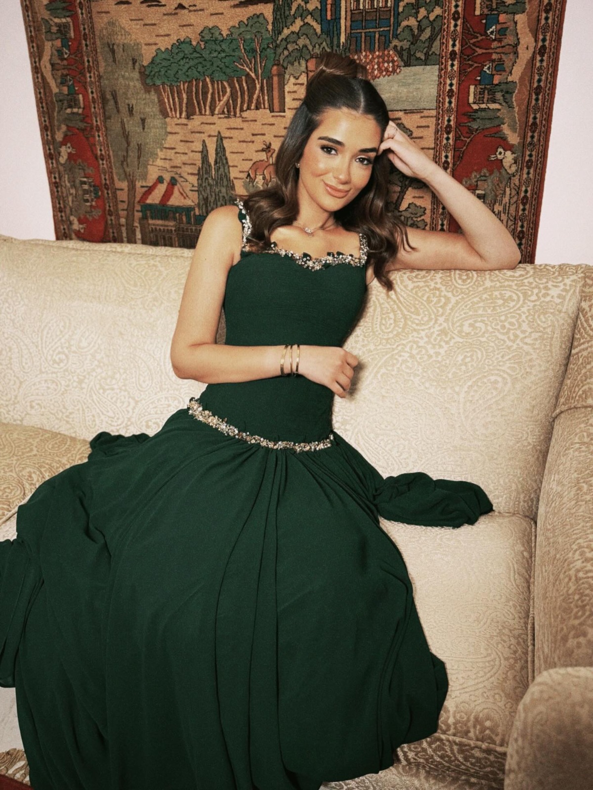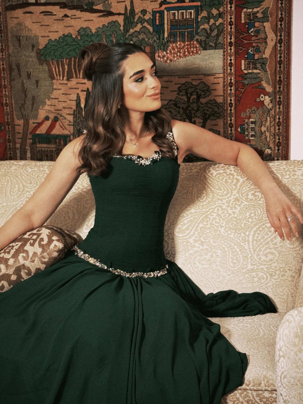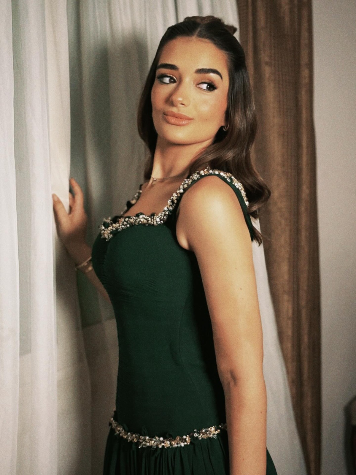 رم - خطفت #ملك_أحمد_زاهر الأنظار بإطلالة تحمل عبق الكلاسيكية، في صور جديدة نشرتها عبر حسابها على "إنستغرام". ظهرت بفستان باللون الأخضر الزيتي الغامق، بتصميم أنثوي فخم يذكّر بإطلالات نجمات الزمن الجميل، حيث تزيّن بتطريزات فضية رقيقة على الكتف والخصر منحت اللوك لمسة ملكية راقية. واختارت تسريحة شعر بسيطة تنسدل بنعومة مع مكياج دافئ يكمّل الأجواء الكلاسيكية للإطلالة.