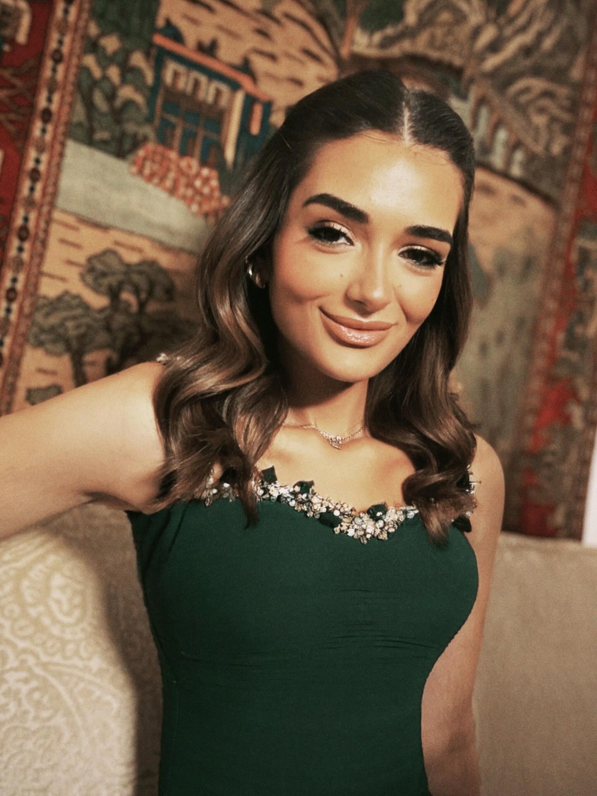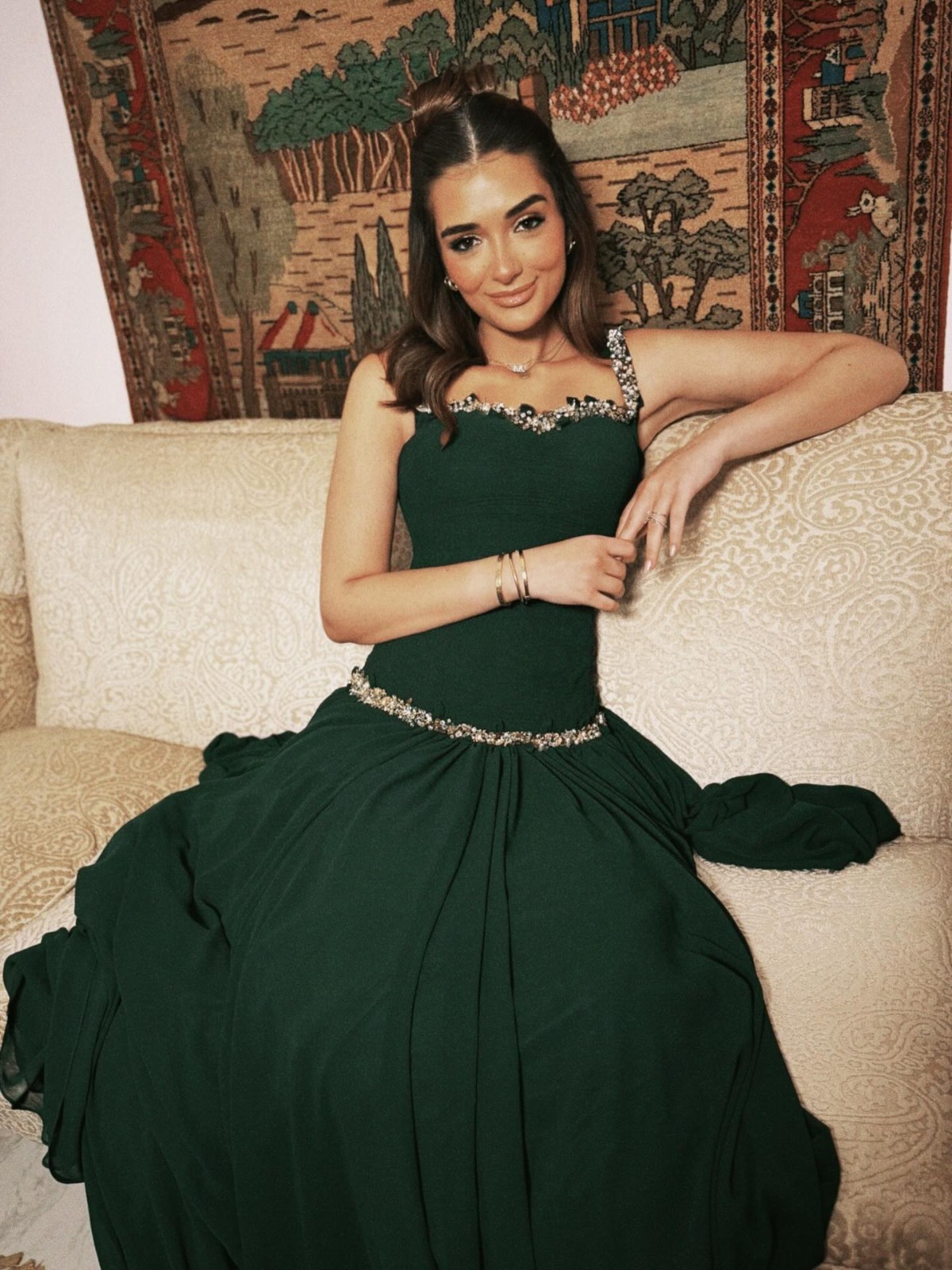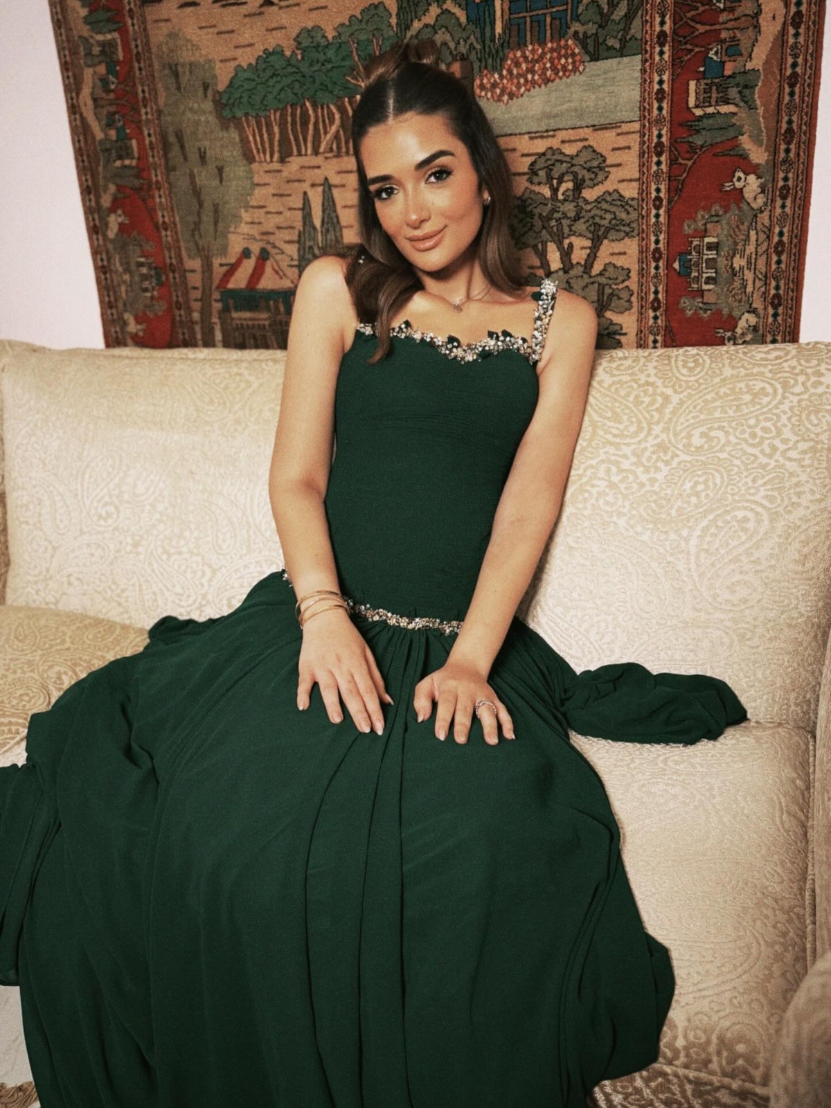 رم - خطفت #ملك_أحمد_زاهر الأنظار بإطلالة تحمل عبق الكلاسيكية، في صور جديدة نشرتها عبر حسابها على "إنستغرام". ظهرت بفستان باللون الأخضر الزيتي الغامق، بتصميم أنثوي فخم يذكّر بإطلالات نجمات الزمن الجميل، حيث تزيّن بتطريزات فضية رقيقة على الكتف والخصر منحت اللوك لمسة ملكية راقية. واختارت تسريحة شعر بسيطة تنسدل بنعومة مع مكياج دافئ يكمّل الأجواء الكلاسيكية للإطلالة.