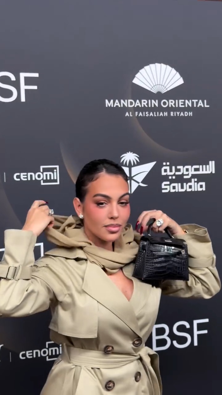 رم - ظهرت #جورجينا_رودريغيز في عرض أزياء منى الشبل ضمن #أسبوع_الموضة_بالرياض، وارتدت بمعطف بستايل Trench باللون البيج، وزينت إطلالتها بوشاح وضعته تارة على رقبتها، وتارة أخرى على رأسها، وكعادتها تفاخرت بخاتم خطبتها من كريستيانو رونالدو