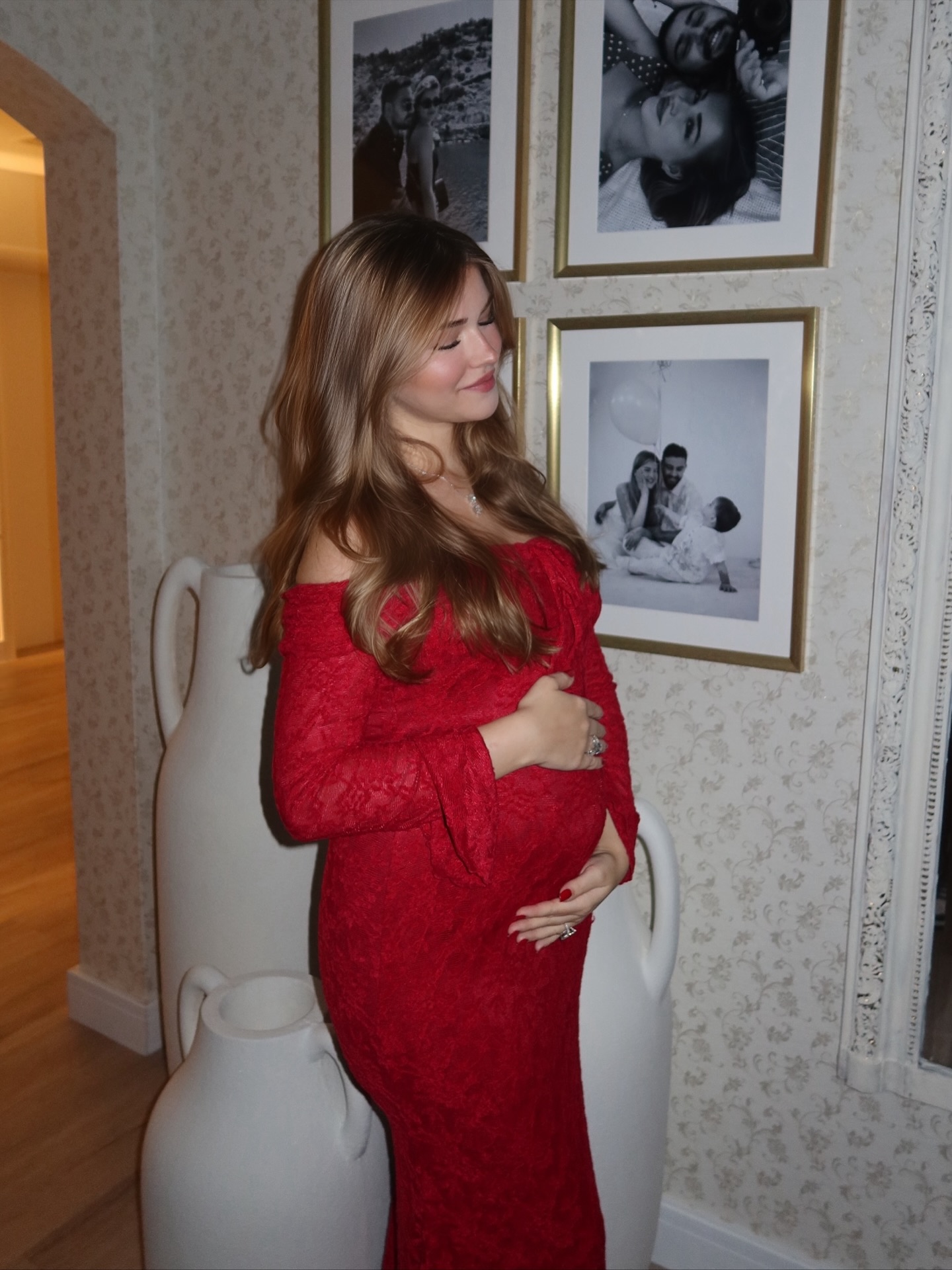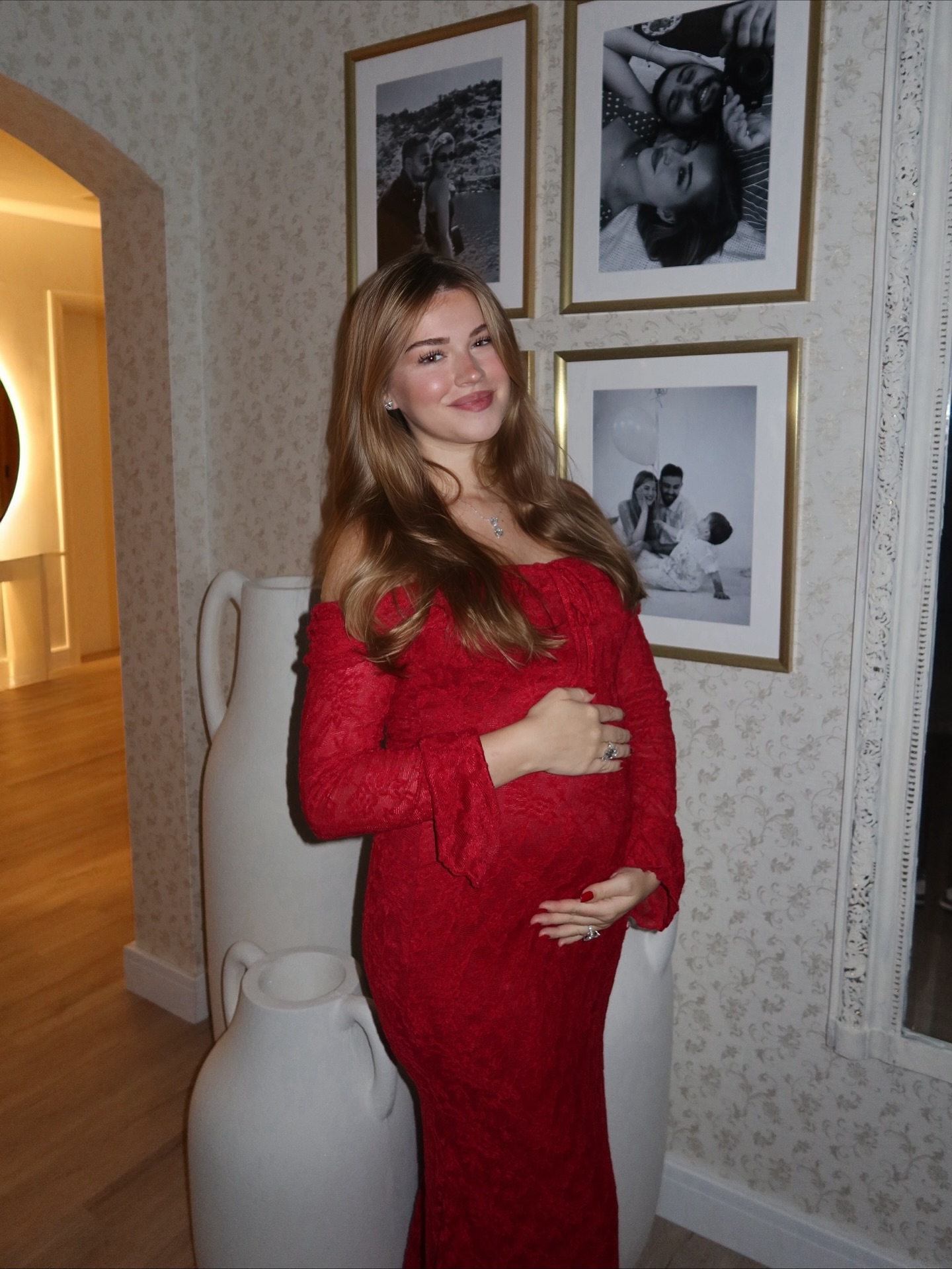 رم - تستمر البلوغر #أليونا بمشاركة متابعيها صورًا من حملها الثالث عبر "إنستغرام"، واختارت لإطلالتها الأحدث فستانًا ناعمًا بالدانتيل باللون الأحمر، أظهرها بشكل جذاب وأنثوي للغاية، أتى الفستان بستايل الـ off shoulder ونسقت معه سلسلة صغيرة، واعتمدت الشعر المنسدل