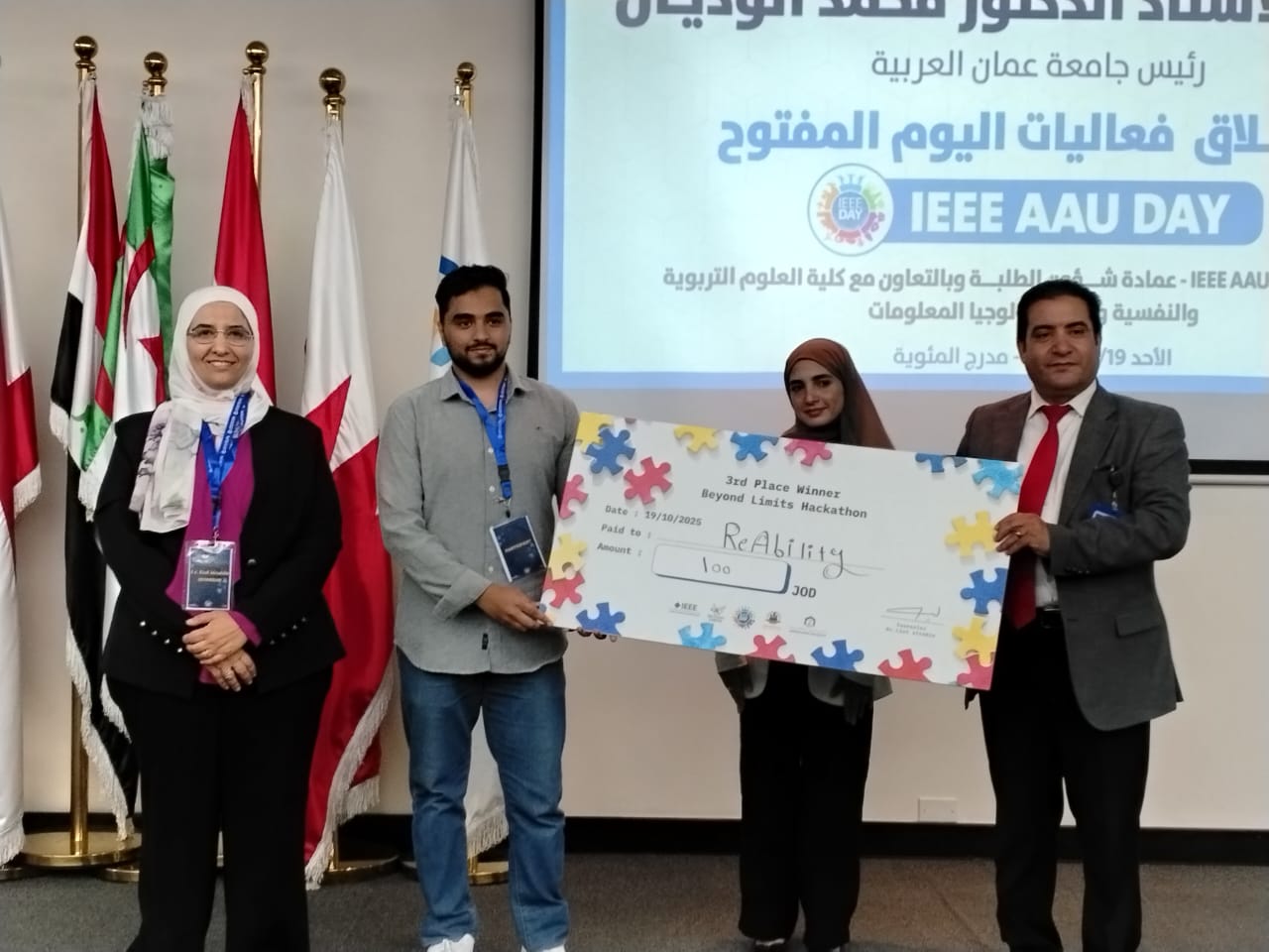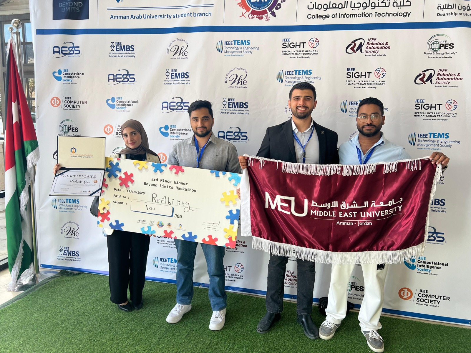 حقق طلبة كلية تكنولوجيا المعلومات في جامعة الشرق الأوسط إنجازًا جديدًا بحصولهم على المركز الثالث في هاكاثون "Beyond Limits" الذي أقيم ضمن فعاليات اليوم المفتوح لفرع IEEE في جامعة عمان العربية، تحت شعار "Puzzle of Possibilities".