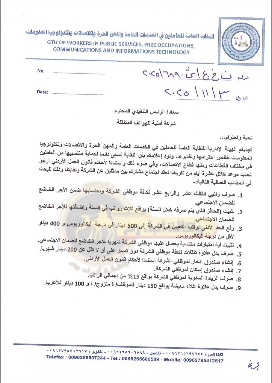 تهديكم الهيئة الإدارية للنقابة العامة للعاملين في الخدمات العامة والمهن الحرة والاتصالات وتكنولوجيا المعلومات خالص احترامها وتقديرها، ونود إعلامكم بأن النقابة تسعى دائما لحماية منتسبيها من العاملين في مختلف القطاعات ومنها قطاع الاتصالات، وفي ضوء ذلك واستنادا لأحكام قانون العمل الأردني أرجو تحديد موعد خلال عشرة أيام من تاريخه لعقد اجتماع مشترك بين ممثلين عن الشركة ونقابتنا وذلك للبحث في المطالب العمالية التالية: