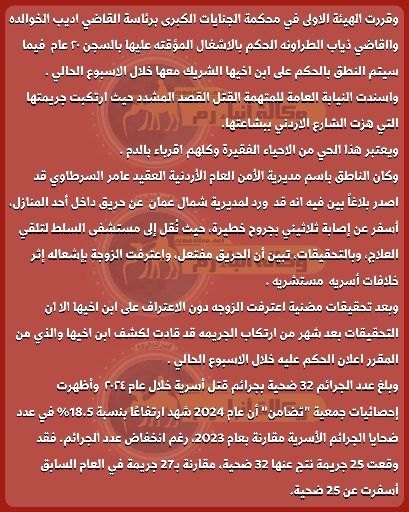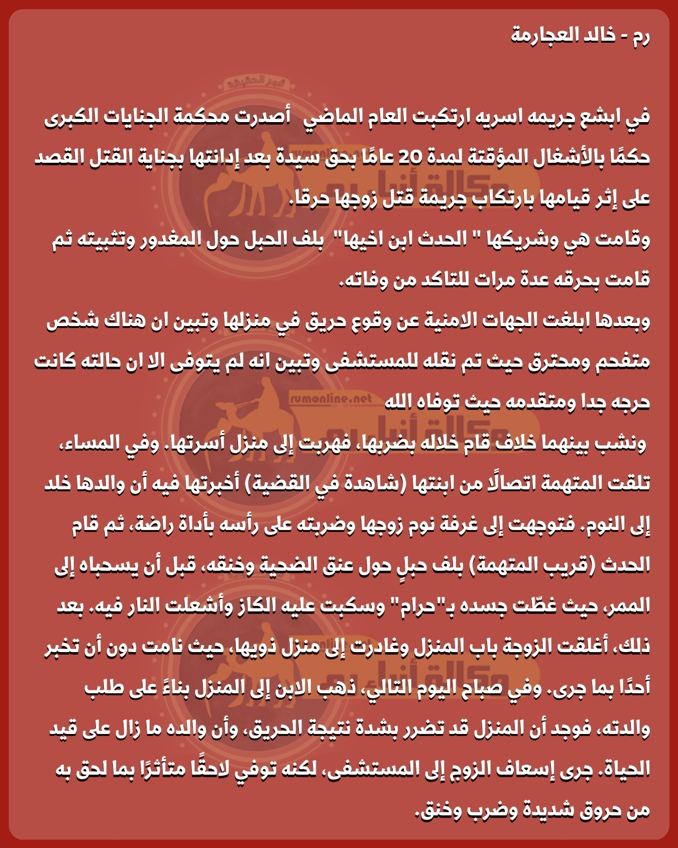 السجن 20 عاما لامرأة ارتكبت ابشع جريمة قتل بحق زوجها و"رم" تنشر التفاصيل .. !