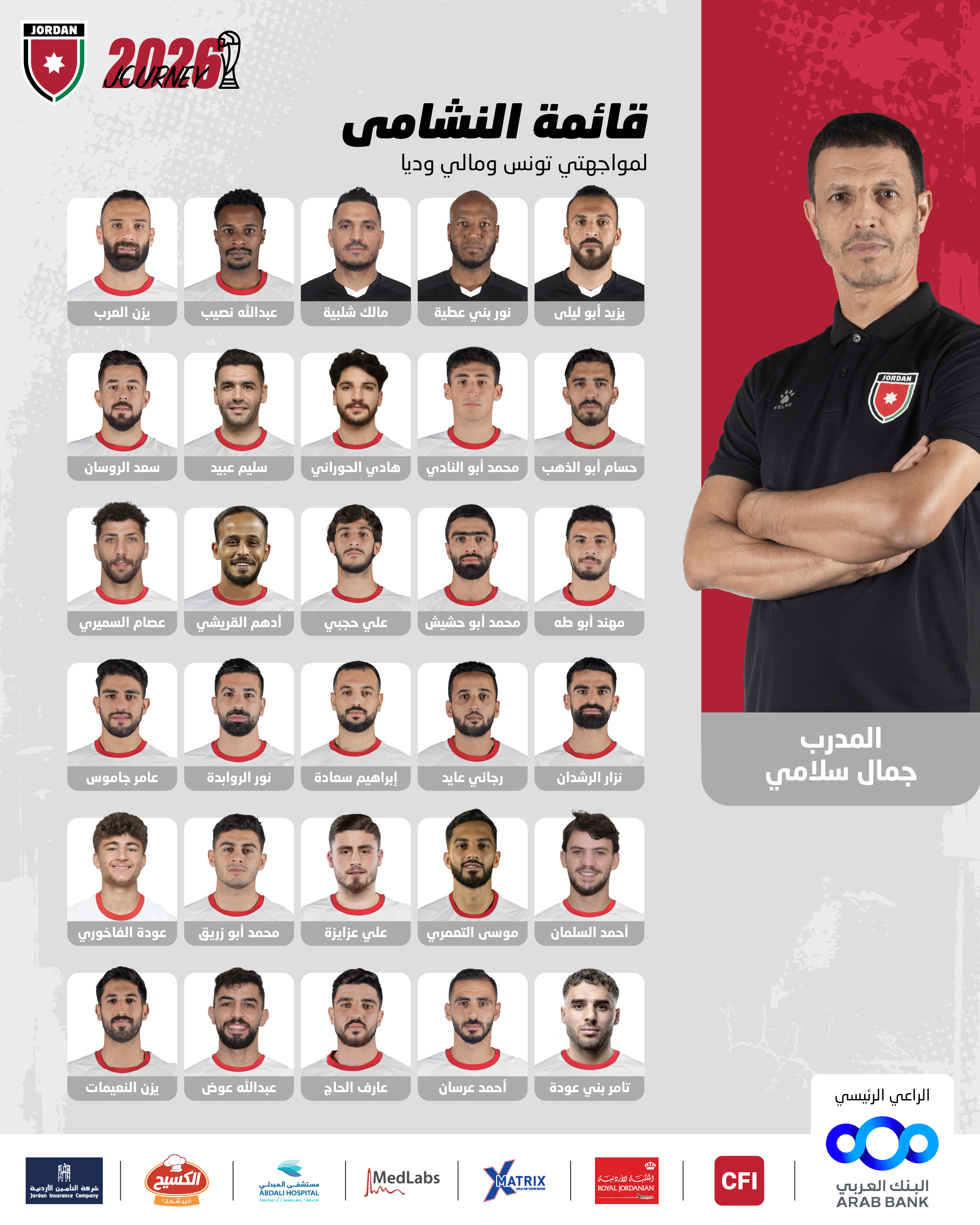 رم - أعلن الجهاز الفني للمنتخب الوطني بقيادة المدرب جمال سلامي، قائمة اللاعبين استعدادا لمواجهتي تونس ومالي وديا، في إطار التحضيرات لخوض بطولة كأس العرب فيفا 2025، ونهائيات كأس العالم 2026.