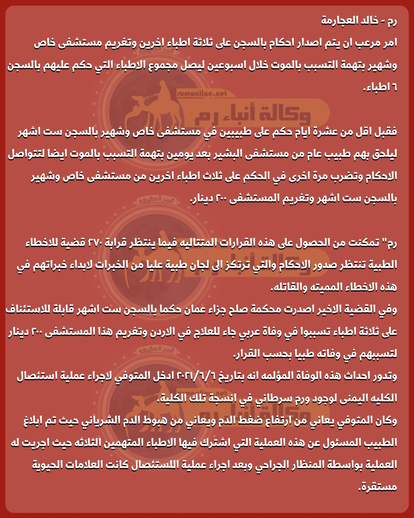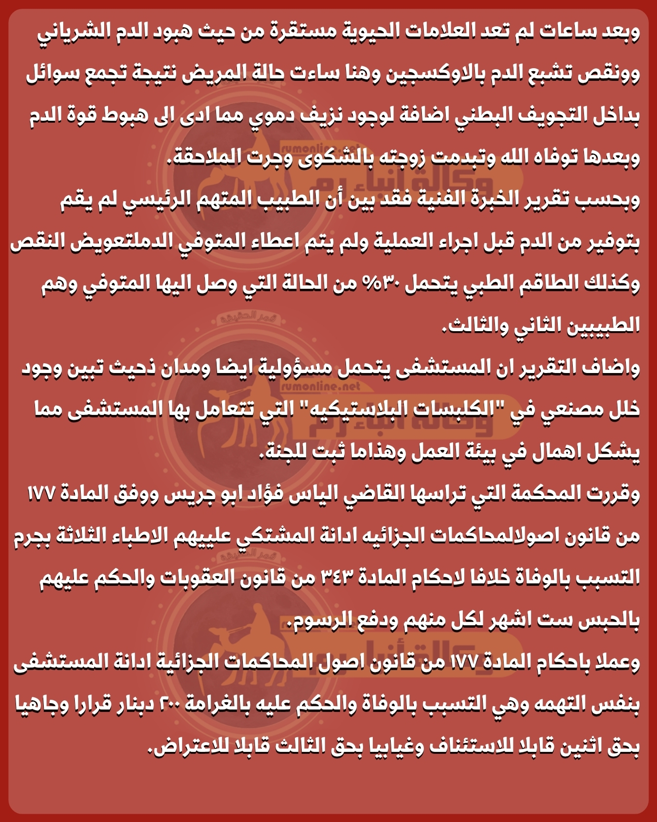 الاخطاء الطبية " التسبب بالموت" يضرب للمره الثالثة خلال اسبوعين بمحاكمة ثلاث اطباء جدد بالحبس 6 اشهر