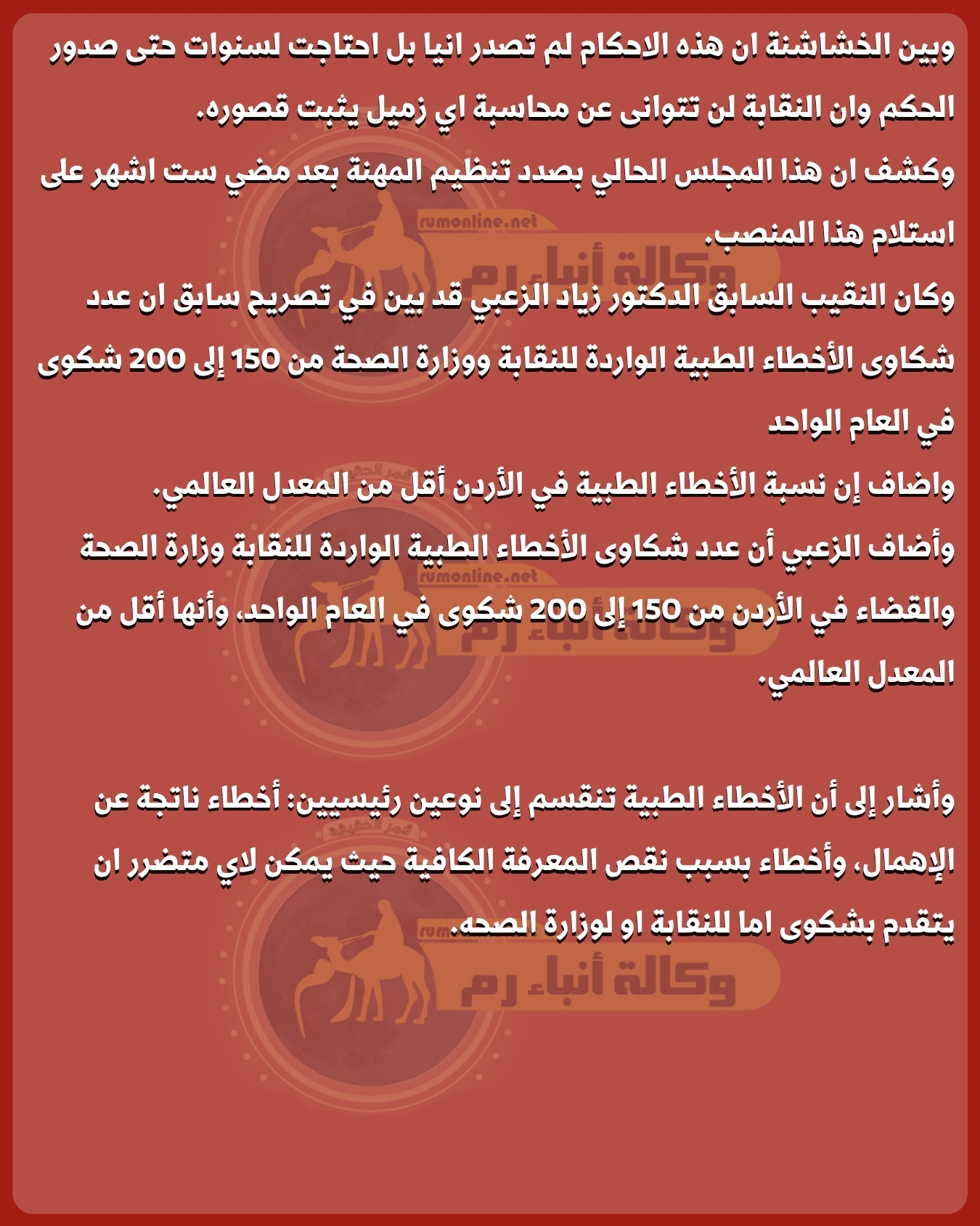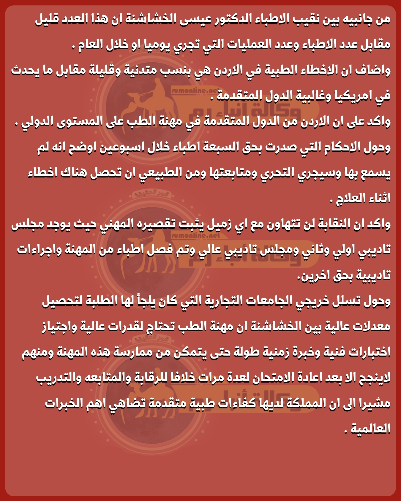 رم - * الخشاشنة: سيتم تنظيم المهنة والاخطاء الطبية ضمن المستويات المنخفضة