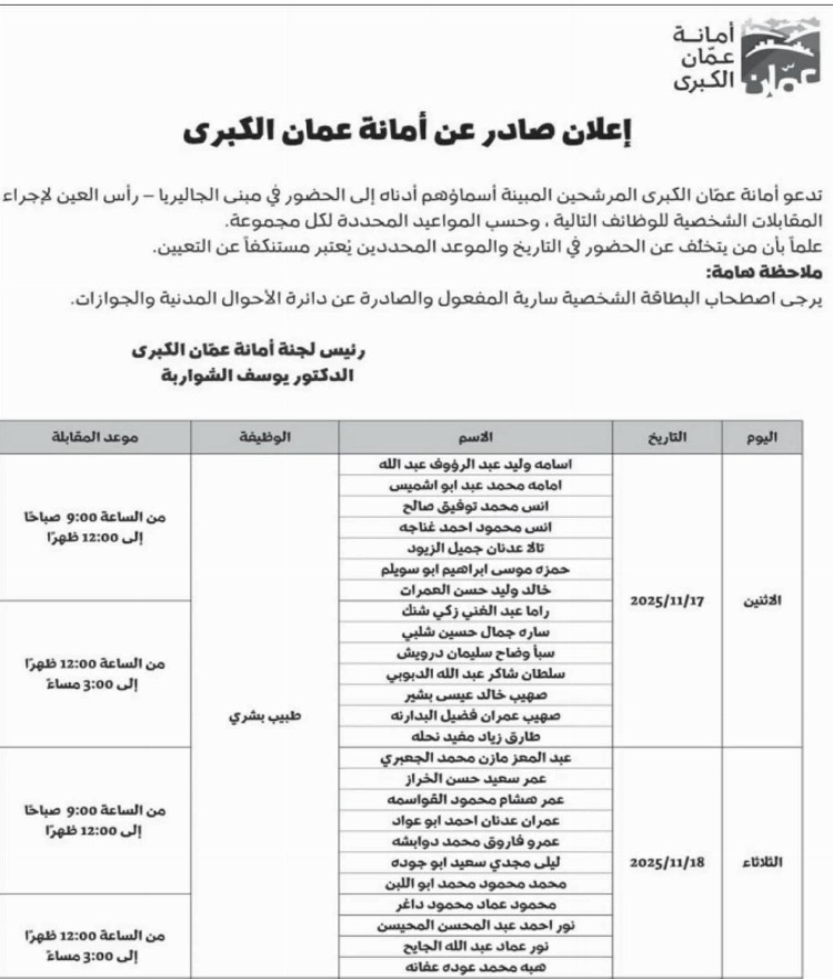 بالأسماء .. مدعوون للمقابلات الشخصية في أمانة عمان